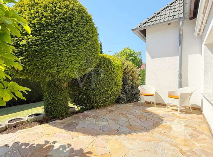 Die einladende Terrasse, die vom Wohnzimmer aus betreten werden kann, ist mit aufwendigen Polygon-Natursteinen belegt und erweitert im Sommerhalbjahr den Wohnbereich. Der Blick in den herrlich eingewachsenen Garten lädt zu gemütlichen Stunden ein.