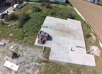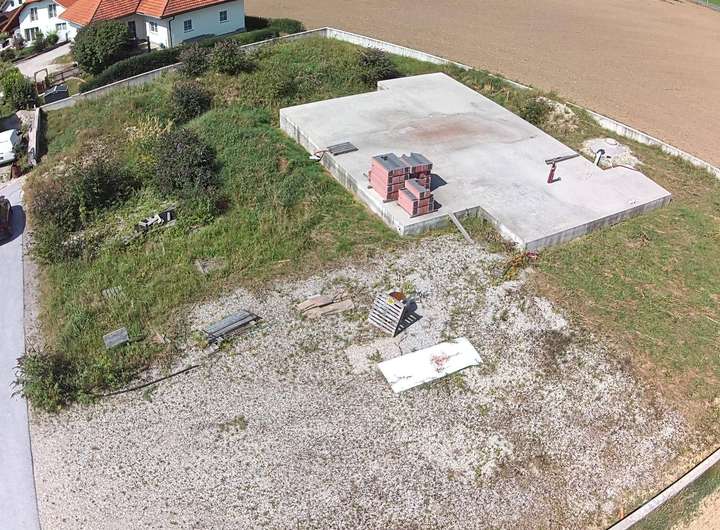 Baugrundstück mit Bodenplatte und Einfriedung.