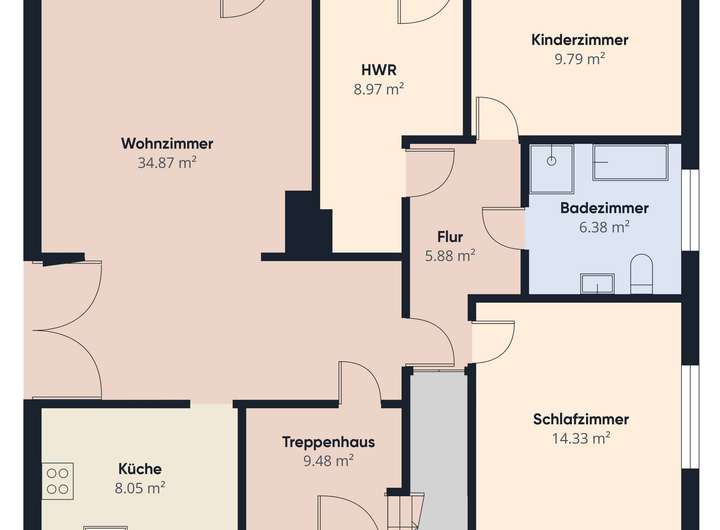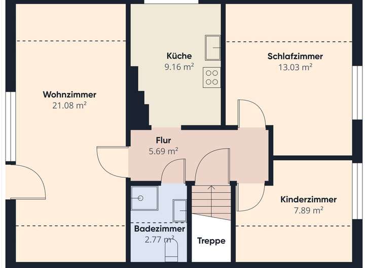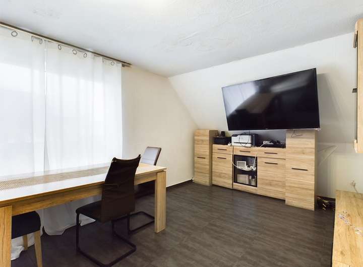 - Dachgeschoss: Wohnzimmer, Schlafzimmer, Kinderzimmer, Küche, Badezimmer, Flur, Balkon (renoviert)