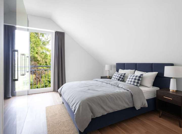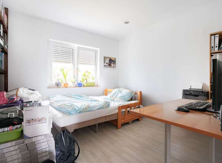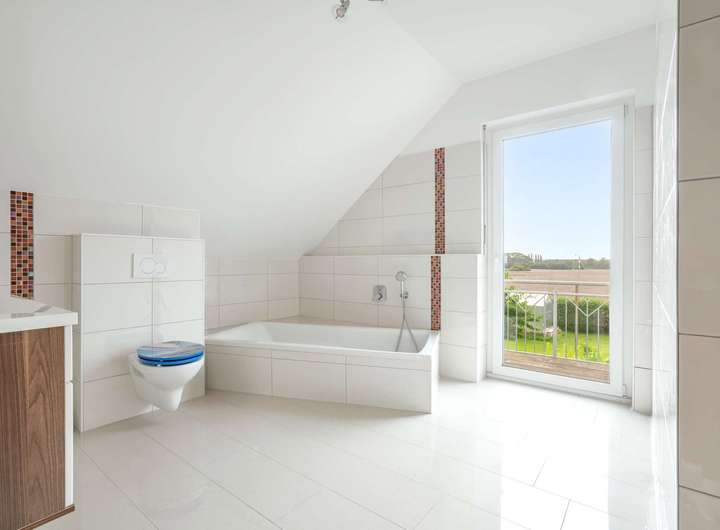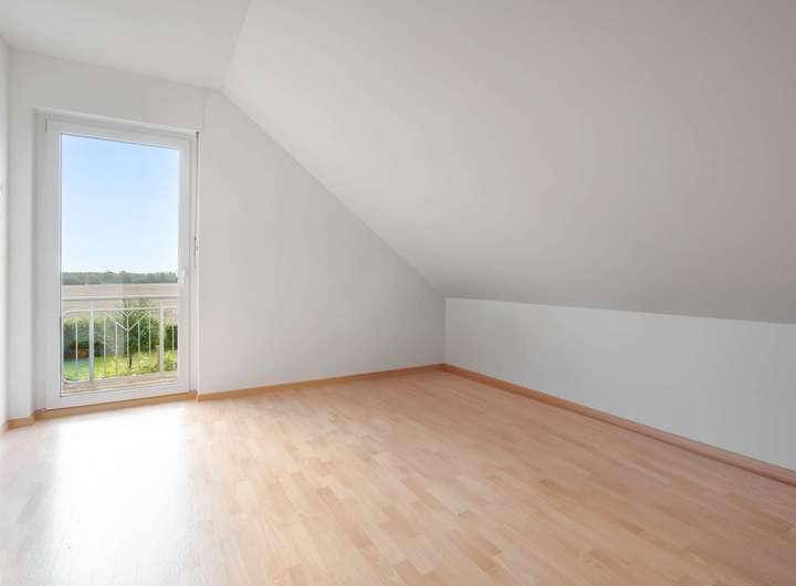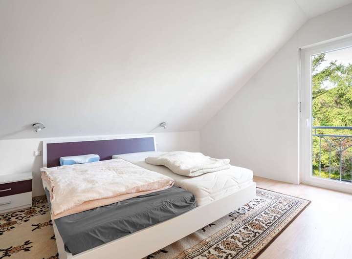 Das Obergeschoss umfasst drei Schlafzimmer, von denen eines über einen Zugang zu einem Balkon mit freiem Blick ins Grüne verfügt. Hier erleben Sie Ruhe und Natur pur. Abgerundet wird die Etage durch ein komfortables, neuwertiges Badezimmer mit Badewanne und direktem Balkonzugang.