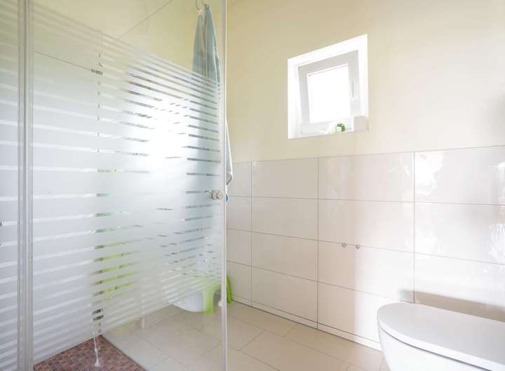 Im Erdgeschoss befinden sich außerdem ein praktischer Hauswirtschaftsraum mit Glasfaseranschluss, der Platz für Waschmaschine, Haustechnik und die Steuerung der Photovoltaikanlage bietet, sowie ein modernes Badezimmer mit Dusche und Fenster.