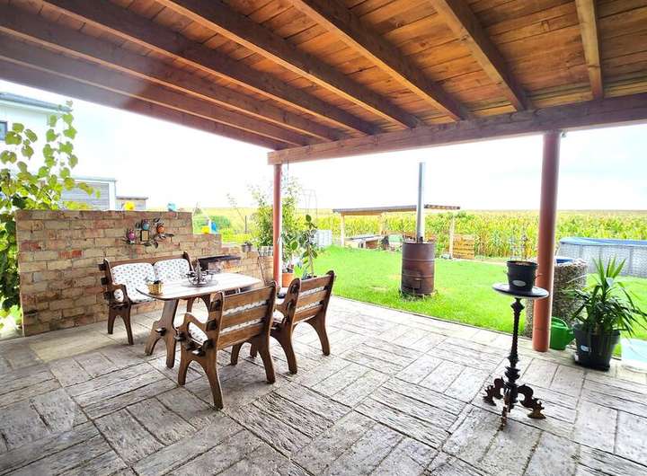 Der offene Wohnbereich bildet das Herzstück des Hauses und führt direkt auf eine große Terrasse, die in den weitläufigen Garten übergeht, der ideale Ort für entspannte Stunden im Freien.
