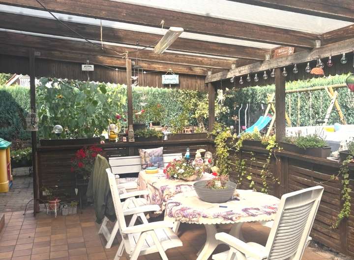 Die großzügige, überdachte Terrasse sowie der eingewachsene Garten laden zum Entspannen, Verweilen und auch zu geselligen Stunden im Freien ein.
