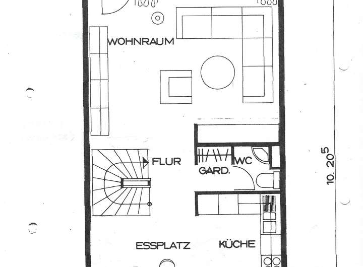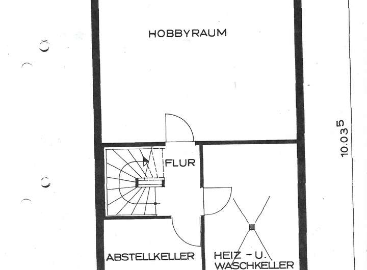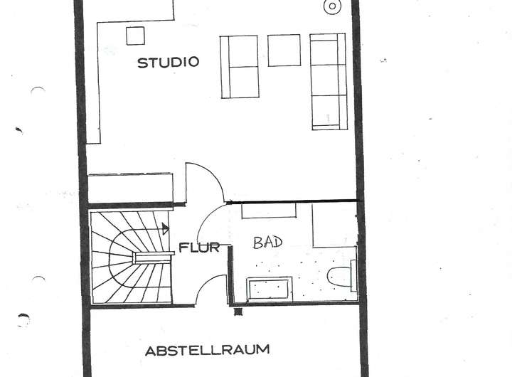 Wie der Originalgrundriss zeigt, teilt sich das Reihenhaus in Keller mit Hobbyraum, Erdgeschoss, Obergeschoss und Dachgeschoss (Studio) auf.