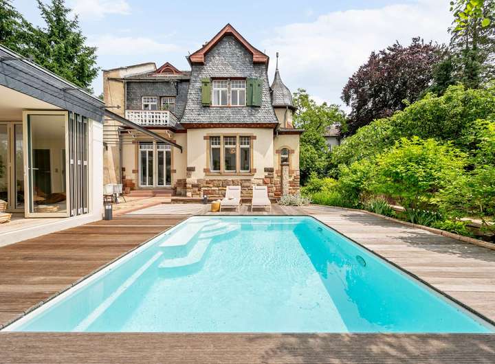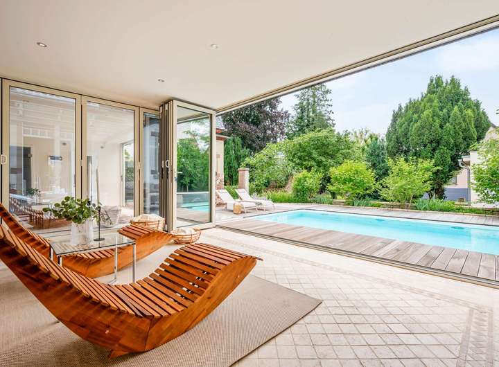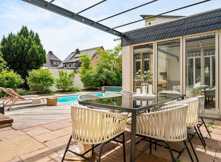 Auf der ersten Ebene befindet sich das großzügige und lichtdurchflutete Wohnzimmer mit Erker, das schöne Esszimmer, eine stilvolle Küche und ein weiteres Zimmer, das sich ideal als Büro- oder Kinderzimmer eignet. Von diesem Stockwerk aus gelangen Sie zu den beiden Terrassen des Hauses, die je nach Tageszeit zum Sonnenbaden einladen. Die bodentiefen Fenster des Esszimmers führen Sie direkt zu Ihrem hauseigenen „Kleinod“, einem beheizbaren und beleuchteten Swimmingpool mit offenem Erholungs- und Saunabereich, inklusive Dusche und separater Toilette. Eine herrschaftliche Holztreppe führt Sie über eine Zwischenebene mit Gäste-WC in das Obergeschoss. Hier finden Sie drei weitere Schlafzimmer, die flexibel als Eltern-, Kinder- oder Arbeitszimmer genutzt werden können, sowie ein großzügiges Badezimmer. Dieses ist hochwertig und modern gestaltet mit einer Wanne, einer bodengleichen Dusche mit Glasabtrennung und einem Doppelwaschtisch - aus dem selben Stein, wie die tolle Arbeitsplatte in der Küche.