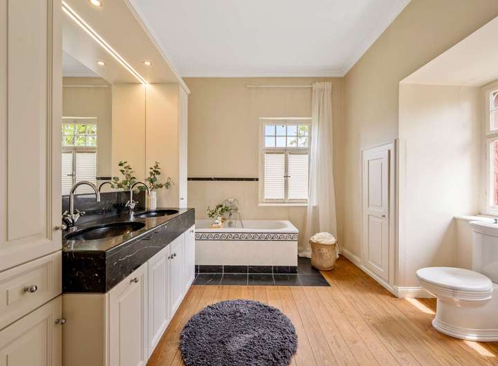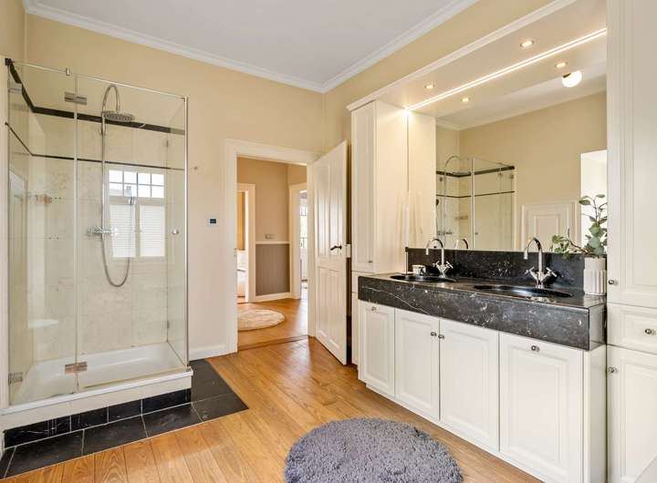 + Hauptbad mit Badewanne, Dusche sowie maßgefertigten Wand- und Einbauschränken