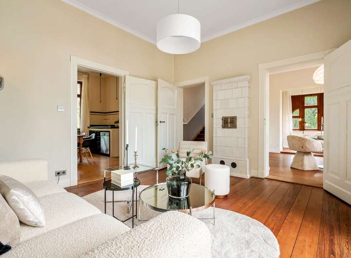Eine Rarität in grüner Idylle: Diese um 1900 erbaute Jugendstilvilla auf einem ca. 1.185 m² großen Grundstück bietet eine perfekte Symbiose aus historischem Charme und modernem Wohnkomfort. Mit ihrer hellen Putzfassade, dekorativen Zierelementen, Holzfenstern, einem Balkon und zwei sonnigen Terrassen zieht dieses Haus jeden Betrachter in seinen Bann. Die Villa besticht durch hohe Decken, hochwertige englische Tapeten, moderne, luxiriöse Einbauten inklusive einer Einbauküche mit hochwertiger Steinarbeitsplatte und Gasherd sowie Pitch Pine Dielen- und Parkettböden. Ergänzt wird das edle Ambiente durch Feinsteinzeugfliesen und einen Kaminofen mit original erhaltenen Kacheln – ein wahres Liebhaberstück!