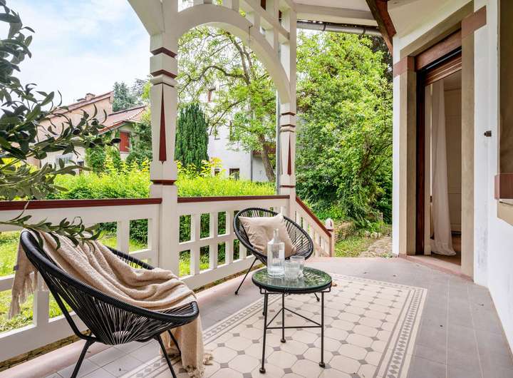 + Wiederherstellung des ursprünglichen Sandsteinbodens in der Veranda – anstelle eines modernen Zementestrichs – für ein authentisches Altbaugefühl