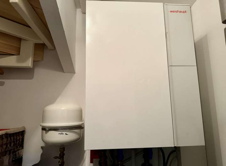 Effiziente Heiztechnik: Luft-Wasser-Wärmepumpe mit 200-Liter-Warmwasserspeicher, kombiniert mit Fußbodenheizung.
