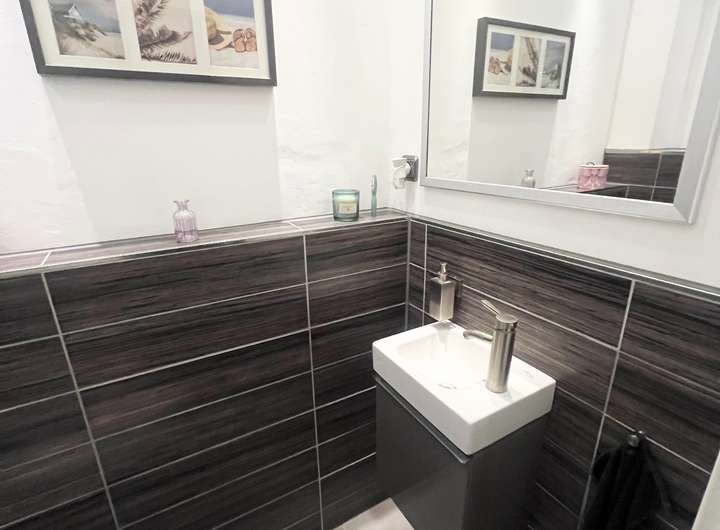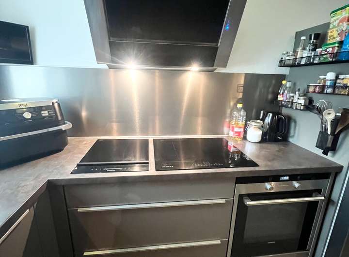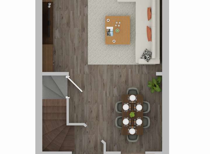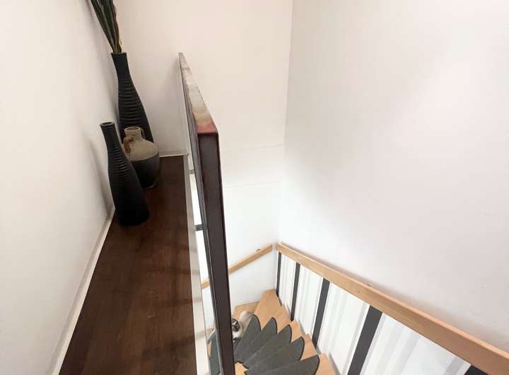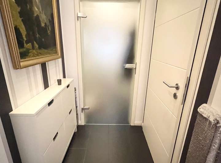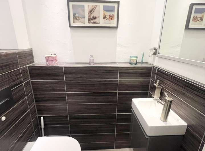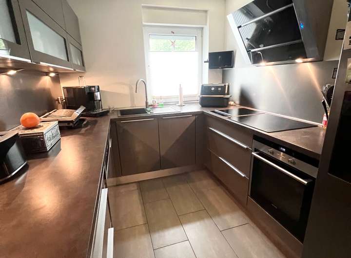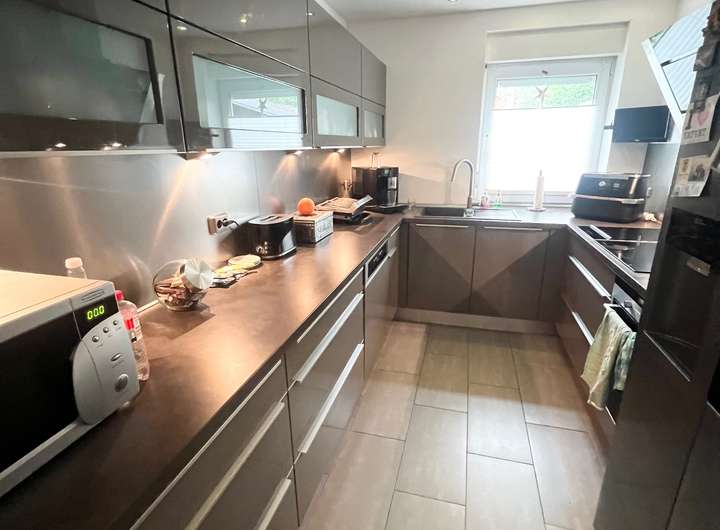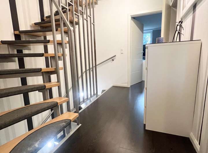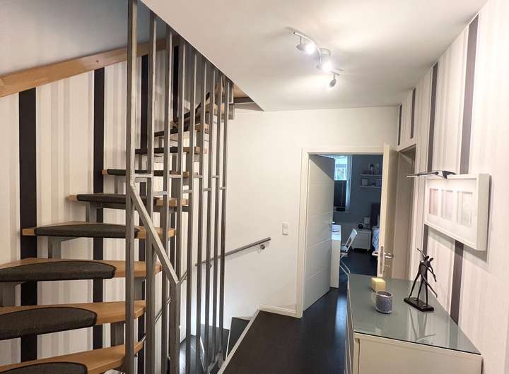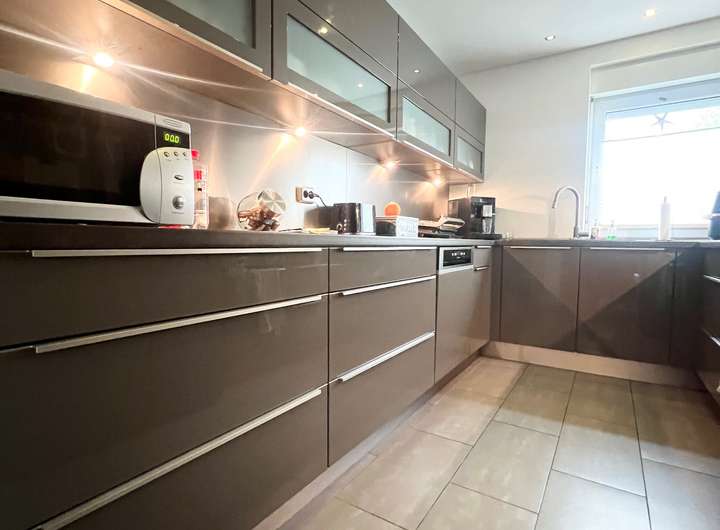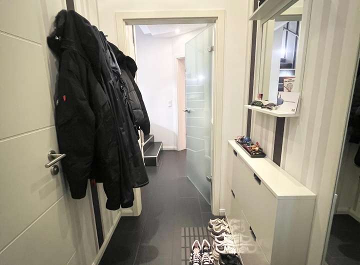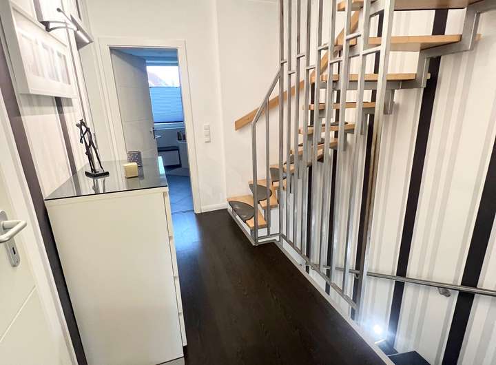 Im Erdgeschoss befinden sich das lichtdurchflutete helle Wohnzimmer, die Küche mit hochwertiger Einbauküche, das Gäste-WC, sowie der Hauswirtschaftsraum mit Waschmaschinenanschluss. Weiterhin bietet ein zusätzlicher Abstellraum unter der Treppe weiteren Stauraum.