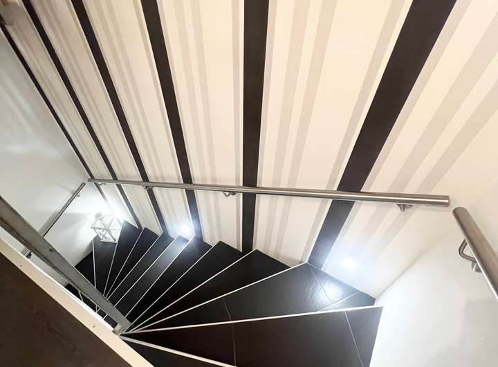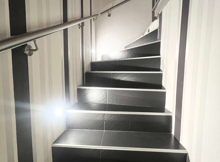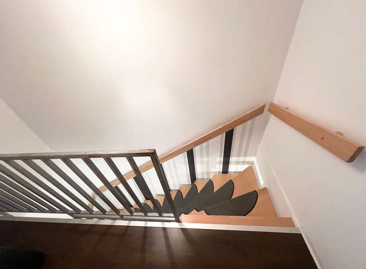 Vom Eingangsflur aus gelangen Sie über eine massive Betontreppe in das Obergeschoss. Hier befinden sich zwei weitere separat begehbare Schlaf-/Kinderzimmer, sowie das Badezimmer.