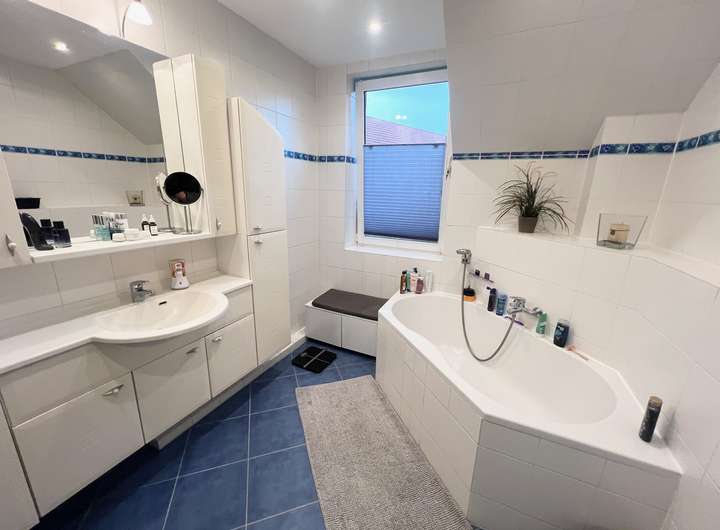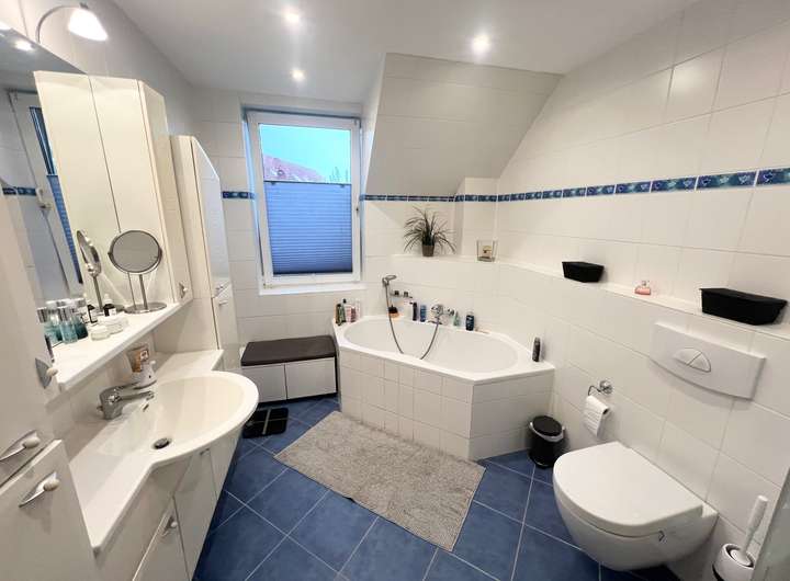 Das Tageslichtbad ist mit einer Eckwanne und Dusche ausgestattet.