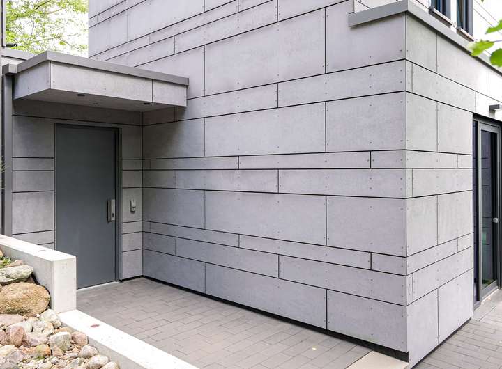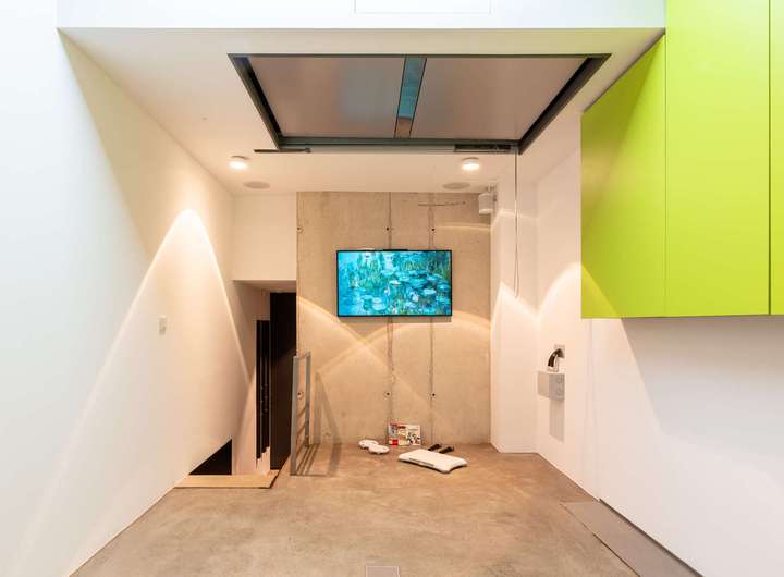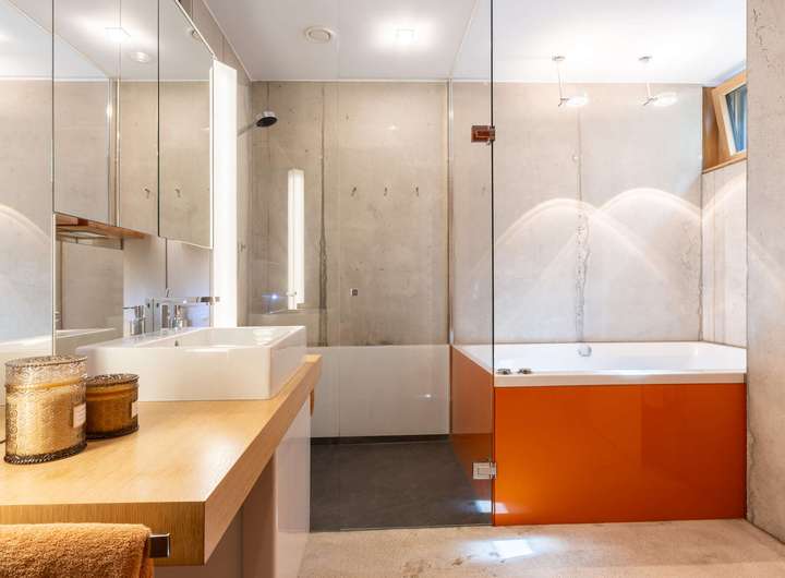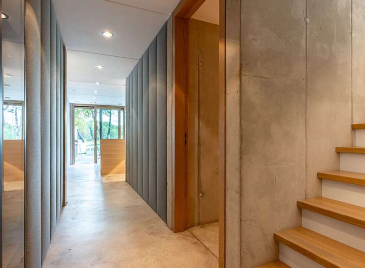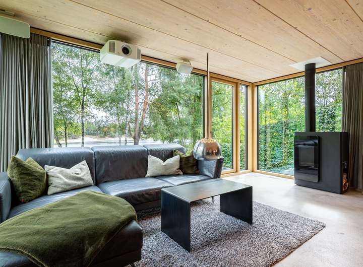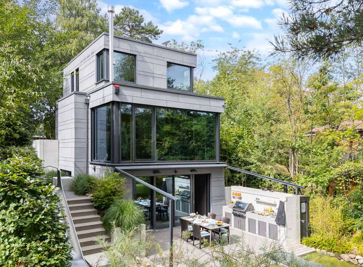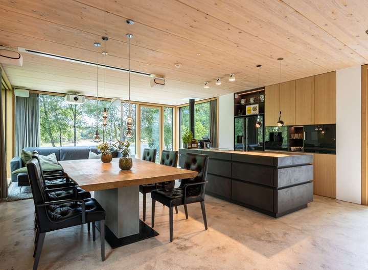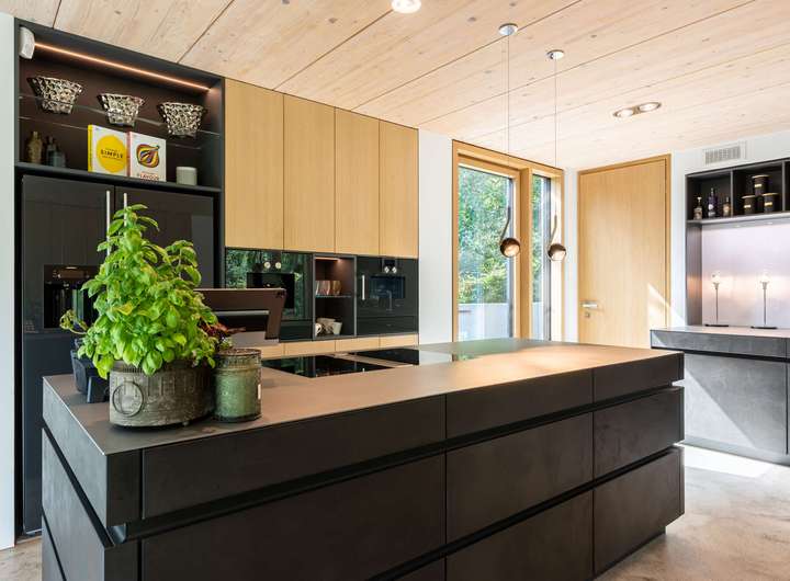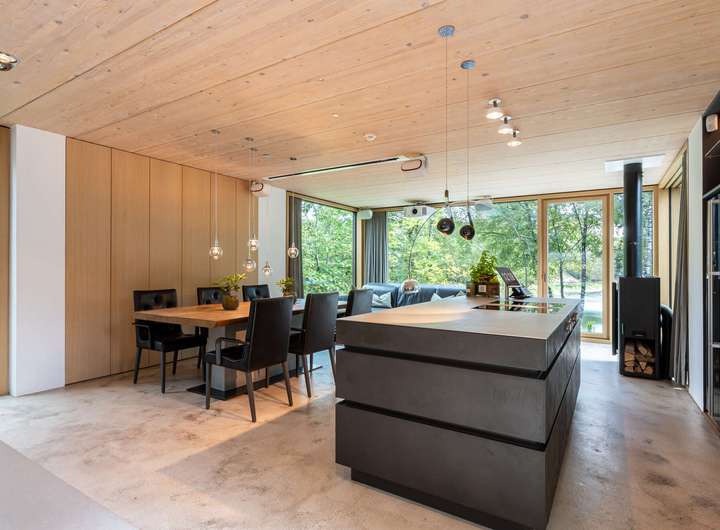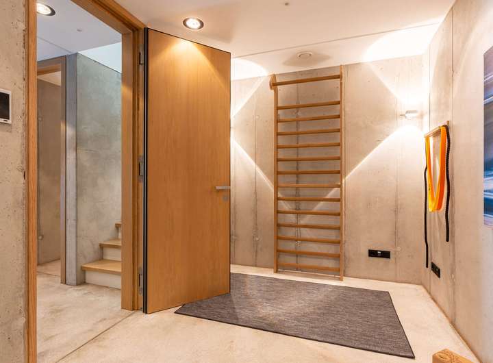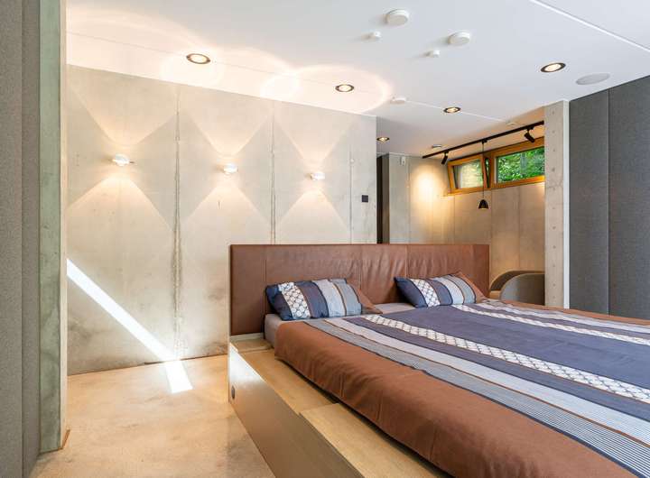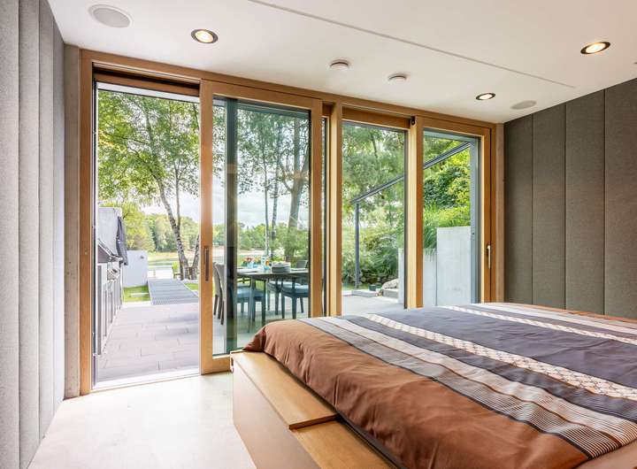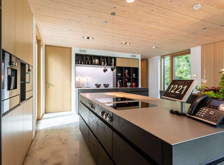 Für höchste Wohnansprüche kamen nahezu ausschließlich Premiummarken zum Einsatz: Einbau-, Wand- und Hängeleuchten von Occio, Sanitärobjekte von Dornbracht und Duravit sowie hochwertige Beschläge von FSB. Eine luxuriöse Leicht-Küche in dunklen Betonfronten, Edelstahloberflächen und hochwertigen Geräten von Bora und Gaggenau. Der Boden des gesamten Hauses besteht aus pflegeleichtem, versiegeltem Sicht-Estrich. In der warmen Holzdecke, die für ein angenehmes Raumklima sorgt, ist modernste Medientechnik mit Beamer, Leinwand und hochwertigen Lautsprechern integriert. Jedes Zimmer, die Garage und der Außenbereich sind mit einem Sonos-Soundsystem ausgestattet. Die Türen im See- und Erdgeschoss sind deckenhoch und aus echtem Eichenholz gefertigt, jeweils im Blockholzrahmen mit umlaufender Schattenfuge und flächenbündigen Beschlägen.
