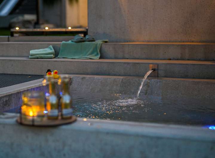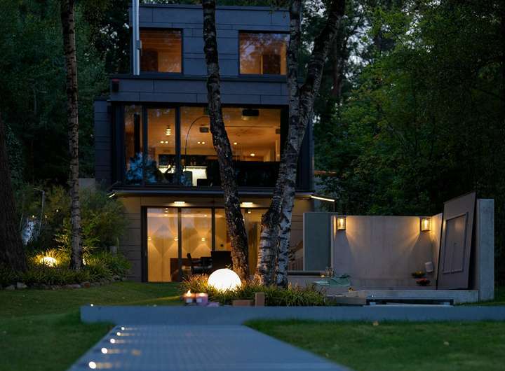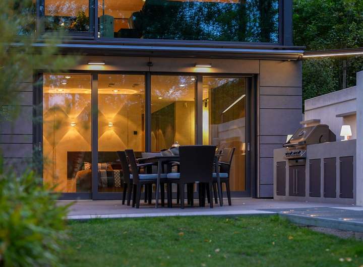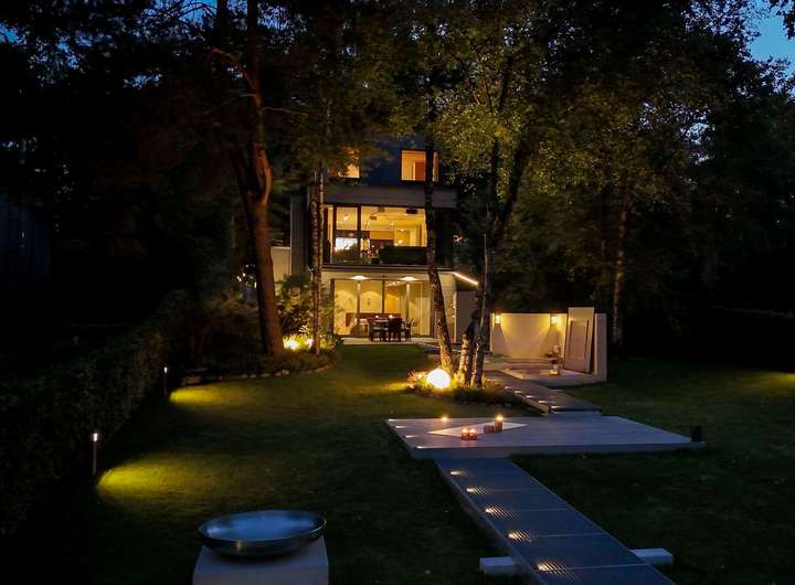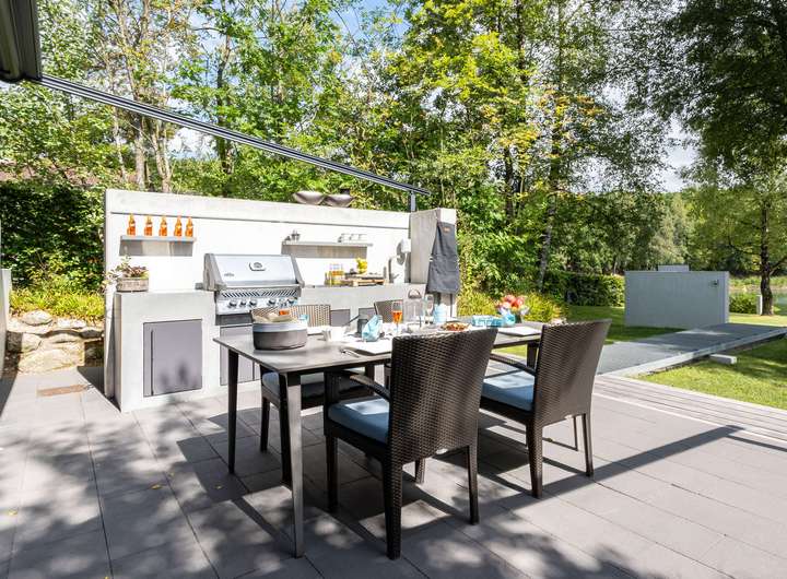 Die Außenküche mit Gasgrill, Steakbrenner, Induktionskochfeld und Spülbecken wird elegant inszeniert. Über eine moderne App-Steuerung lässt sie sich die Poolwanne bequem befüllen und verwandelt das Badevergnügen selbst bei frostigen Temperaturen in ein besonderes Erlebnis. Ein gelungenes Außenbeleuchtungskonzept verwandelt den Garten in eine lebendige Erlebniswelt und vereint Sicherheit, Orientierung und Atmosphäre.
