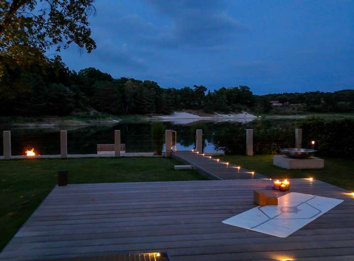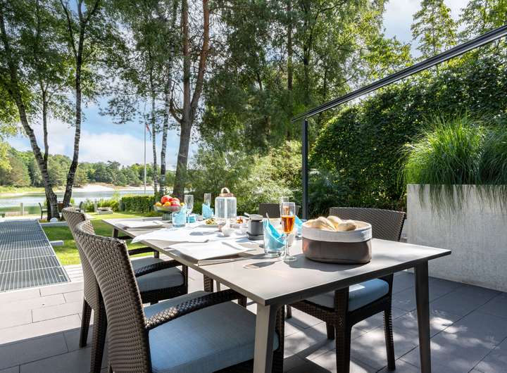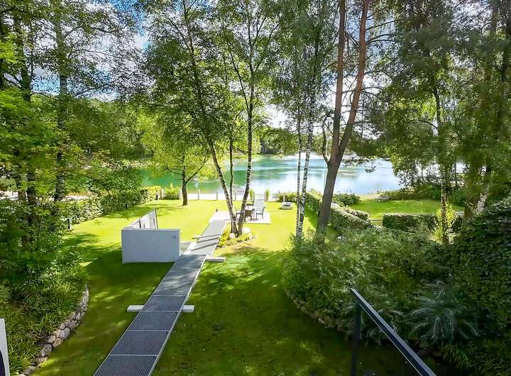Die parkähnliche Gartenanlage öffnet sich zum malerischen Strand am privaten Seeufer. Die Außenküche vereint Design und Funktion und ist der Mittelpunkt geselliger Runden. Die aus massivem Beton gegossene Poolwanne ist ein echtes Unikat zur Entspannung. Durch elegante Terrassierung und Steganlage fügen sich die unterschiedlichen Bereiche des Grundstücks zu einem stimmigen Gesamtbild zusammen.