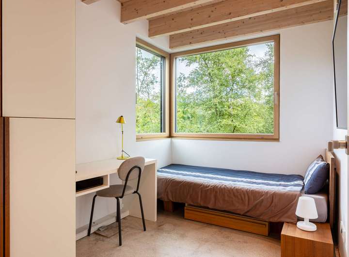 Eine Luft-Wärmepumpe, ein Kaminofen mit Warmluftverteilung, eine kontrollierte Wohnraumbelüftung mit Wärmerückgewinnung und Luftbrunnen, Sonnenschutzverglasung mit Klimaglas sowie eine PV-Anlage arbeiten harmonisch zusammen. In Kombination mit den energetischen Vorteilen des Holzrahmenbaus wird ein Endenergiebedarf von nur 10 kWh/m²·a erreicht.