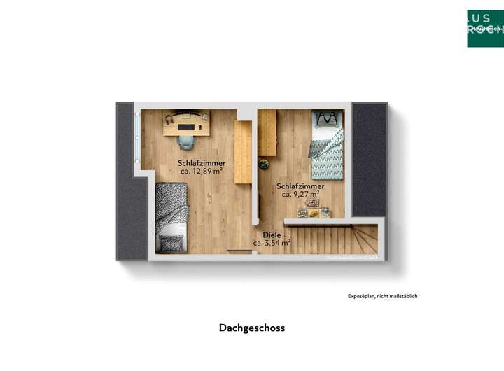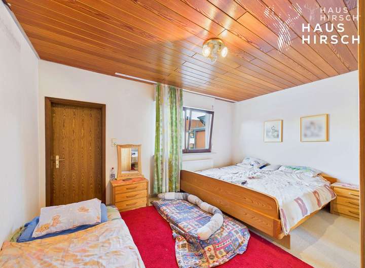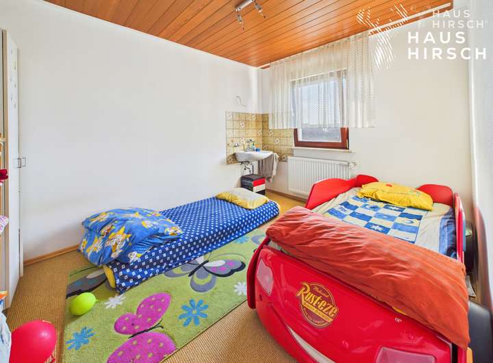 Das Obergeschoss bietet mit einem Schlafzimmer und einem Kinderzimmer ausreichend Platz für eine Familie. Ein weiteres Tageslichtbad mit Dusche, WC und Waschbecken sorgt für zusätzlichen Komfort und ist ideal für den täglichen Gebrauch.