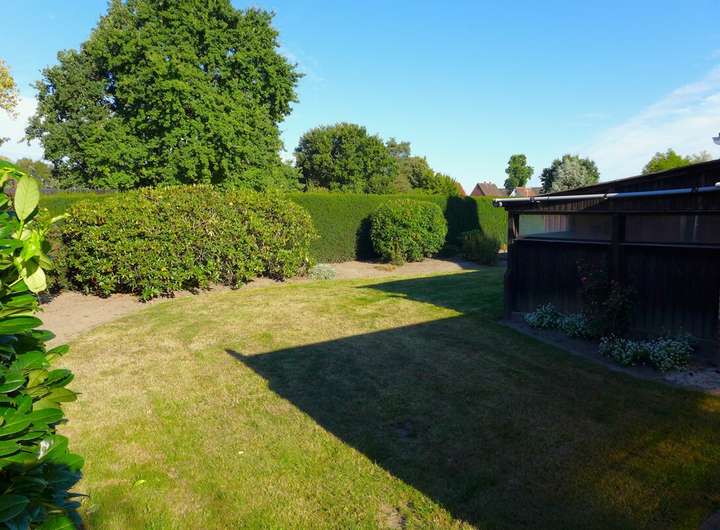 Der große Garten ist derzeit pflegeleicht angelegt und eröffnet Ihnen zahlreiche Gestaltungsmöglichkeiten.