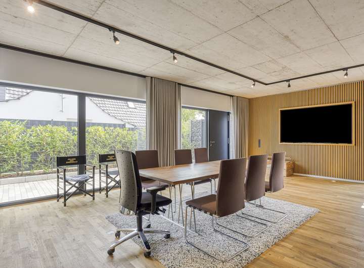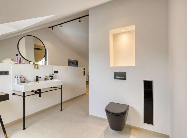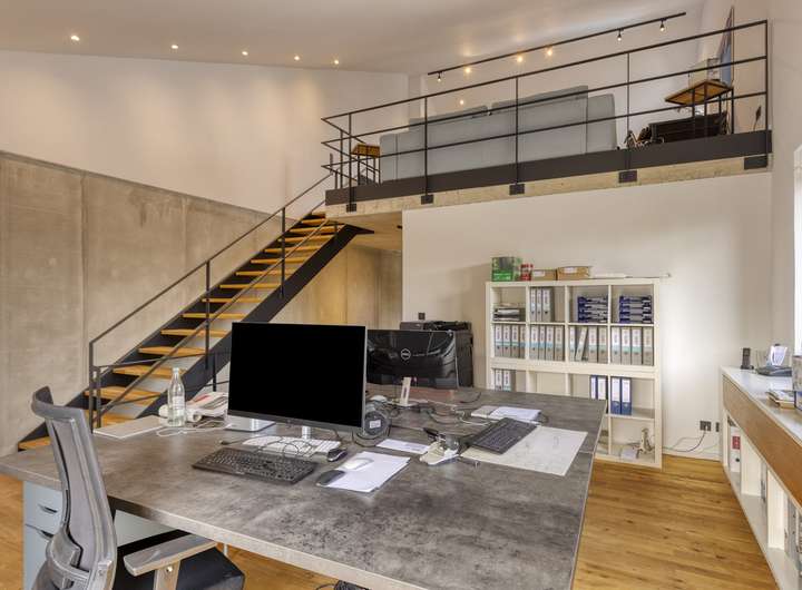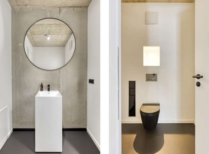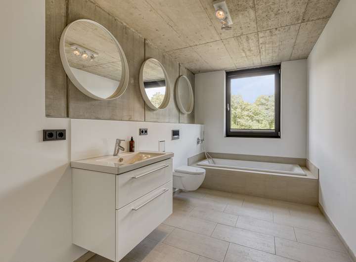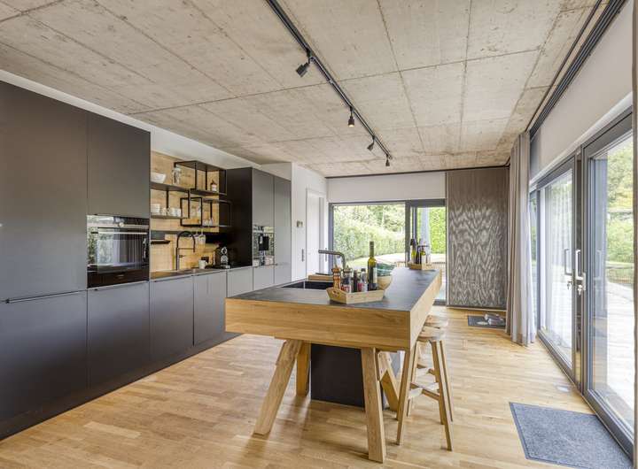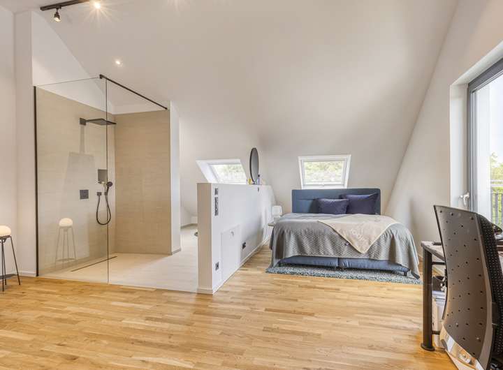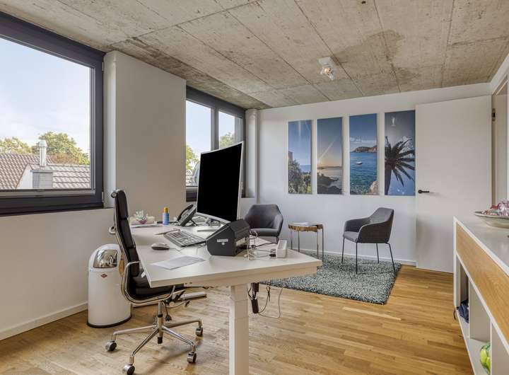 Sichtbeton harmoniert mit warmen Eichenparkett. Bodentiefe Fenster sorgen für optimale Lichtverhältnisse. Ein echtes Highlight ist das Dachgeschoss mit einem hellen Galeriezimmer und einem Duschbad en Suite.