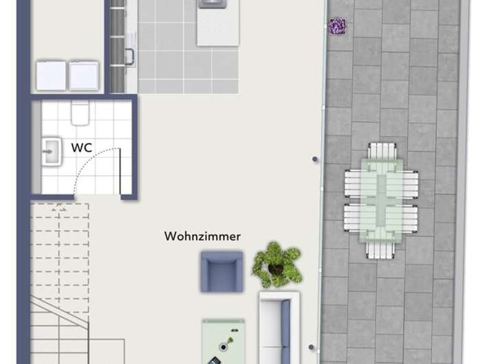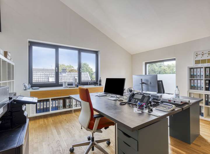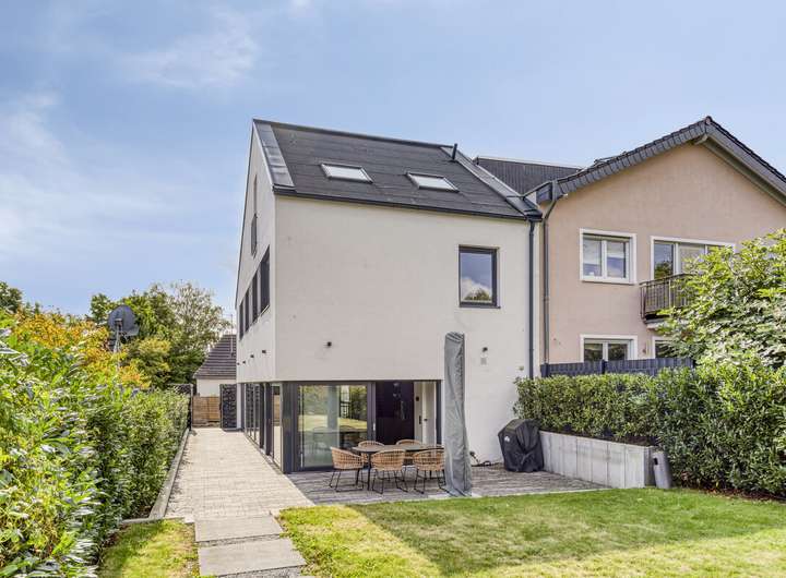 Im Erdgeschoss befindet sich ein offener Wohn-/ Ess- und Küchenbereich mit ca. 68 m², ein Gästebad sowie ein Wirtschaftsraum. Über mehre Schiebeelemente gelangt man auf die ums Haus laufende Terrasse und in den pflegeleichten Garten. Im 1. Obergeschoss befinden sich zwei Schlafzimmer, ein weiterer Wohnbereich sowie ein Fensterbad mit Wanne. Im Dachgeschoss ist ein geräumiges Studio mit offenem Duschbad und einer Wohnfläche von ca. 58 m².