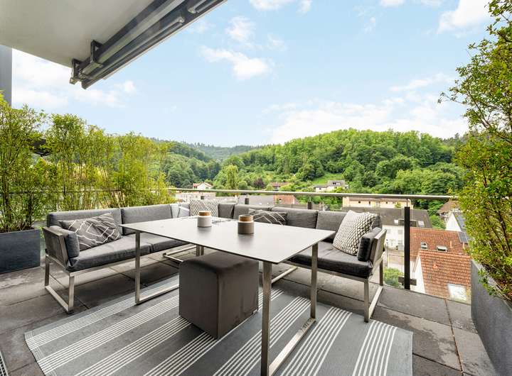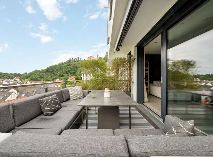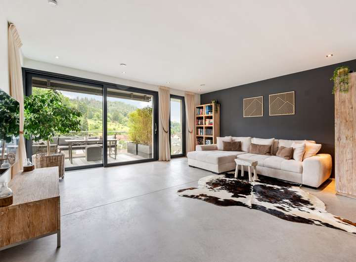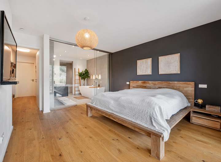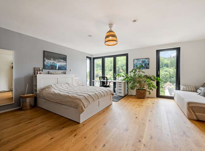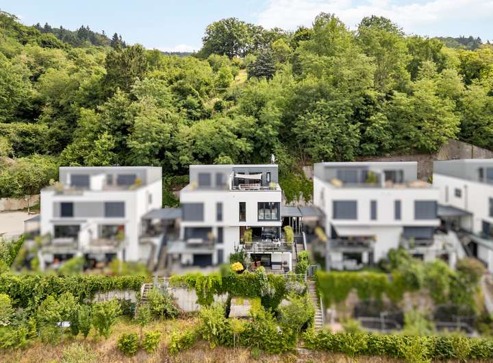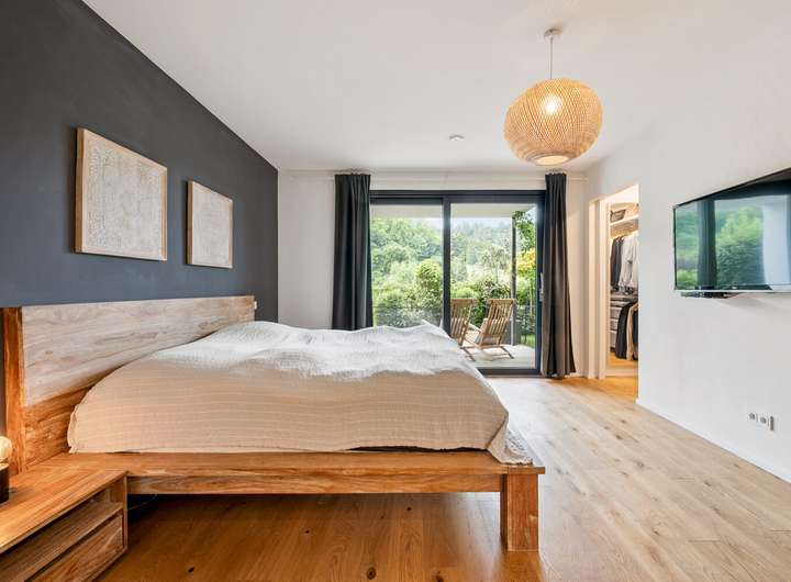 Beim Betreten des Erdgeschosses öffnet sich ein einladender Flur, an den sich eine praktische Garderobe anschließt. Der lichtdurchflutete Wohn- und Essbereich mit Zugang zum Balkon bildet das Herzstück dieses Geschosses und schafft eine harmonische Verbindung zwischen Innen- und Außenraum. Die elegante luxuriöse Küche überzeugt mit klarer Linienführung und hochwertigen Einbauten. Ein Gäste WC und eine Abstellkammer ergänzen die durchdachte Raumaufteilung. Im Obergeschoss erwarten Sie ein heller Flur, zwei komfortable Kinderzimmer, ein stilvolles Badezimmer und eine weitere Abstellkammer. Das Dachgeschoss beeindruckt mit einem großzügigen Dachstudio, einem zusätzlichen Gäste Badezimmer und einer sonnigen Terrasse mit einem traumhaften Fernblick, die einen herrlichen Rückzugsort bietet. Im Gartengeschoss erwartet Sie ein Bereich mit ganz besonderem Charme. Das ruhige Schlafzimmer öffnet sich direkt zur Terrasse und führt nahtlos in den angrenzenden Ankleidebereich. Ein echtes Highlight ist das luxuriöse Bad, das durch eine elegante Glaswand vom Schlafraum abgetrennt ist – modern, offen und mit einem Hauch von Extravaganz. Von der Terrasse führt zudem eine Außentreppe direkt hinunter in den idyllischen Garten. Abgerundet wird dieses Geschoss durch einen praktisch gelegenen Technikraum.
