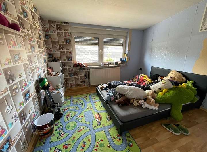 Im Dachgeschoß befinden sich drei gut geschnittene Kinderzimmer sowie ein Badezimmer mit Wanne und Dusche. Eine Garage mit angrenzender Werkstatt, eine Holzterrasse mit Markise runden das Platzangebot ab.