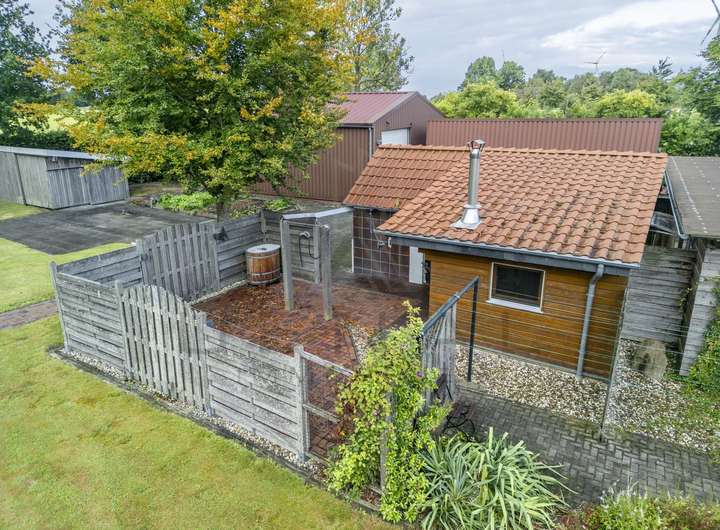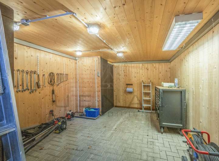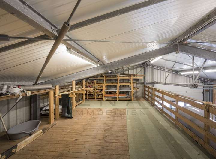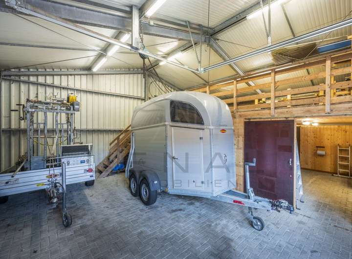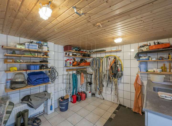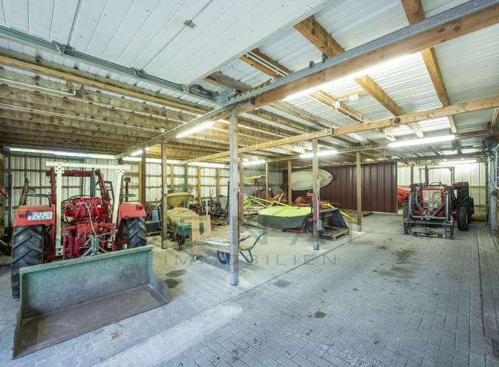 • Nebengebäude: Doppelgarage, Stahlhalle (ca. 300 m², Kraftstrom, Sektionaltore, Schiebetüren), weitere Nebengebäude mit mind. 500 m² Fläche, Holzlager (ca. 80 m³, eingedeckt mit Dachziegeln)