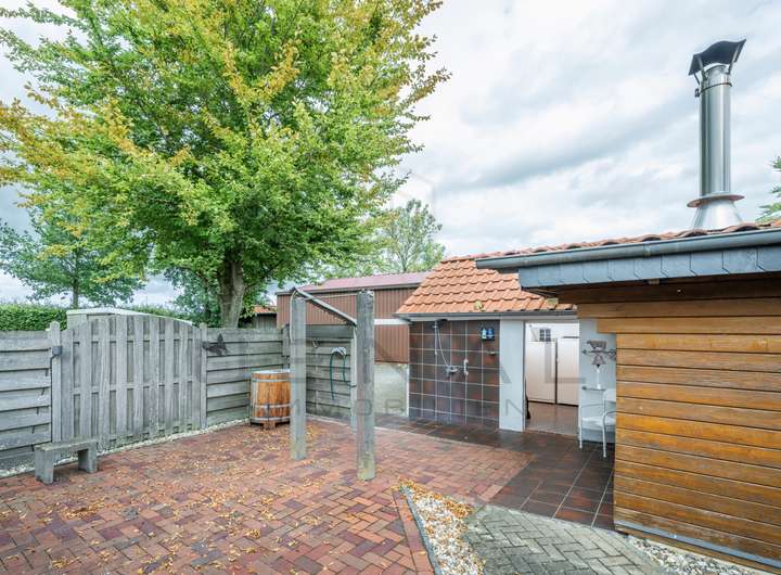 • Wellnessbereich: holzbefeuerte Sauna (4 Liegeplätze / 8 Sitzplätze), Außendusche (warm/kalt), Nebeldusche, Tauchbecken, Kippeimer