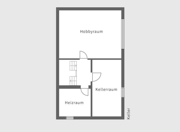 Der Keller bietet zusätzlichen Raum mit einem 32 m² großen Hobbyraum, einem Vorratsraum sowie dem Heizungsraum.