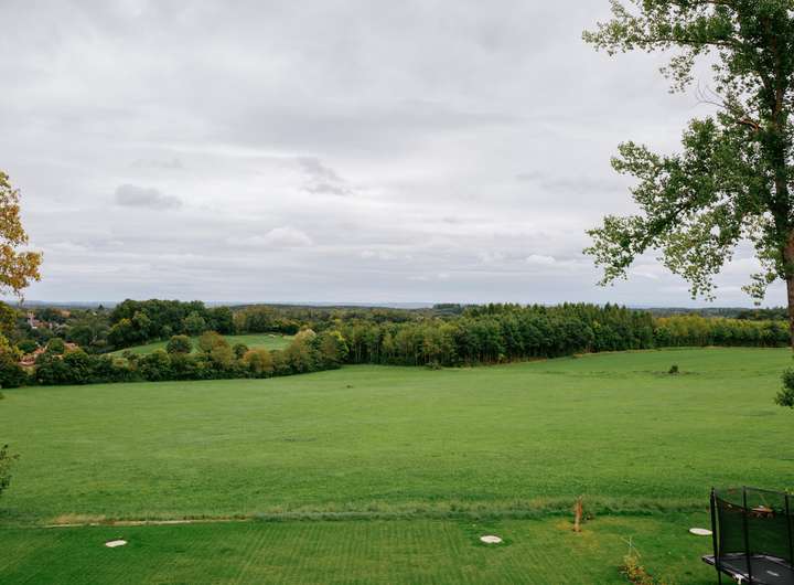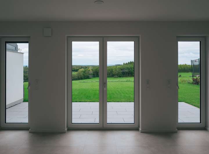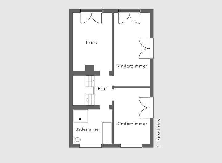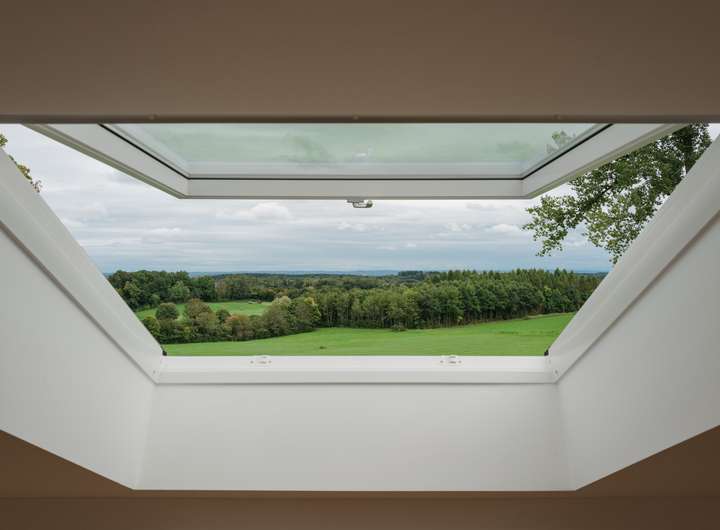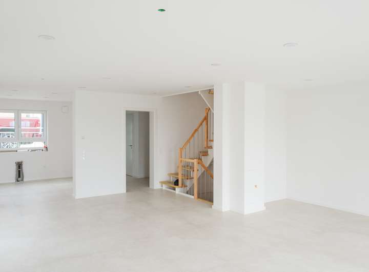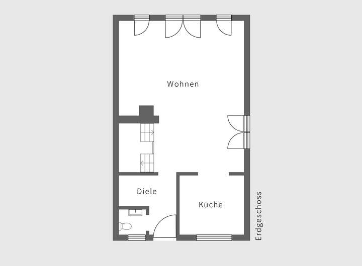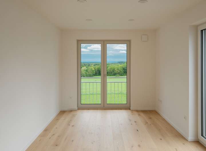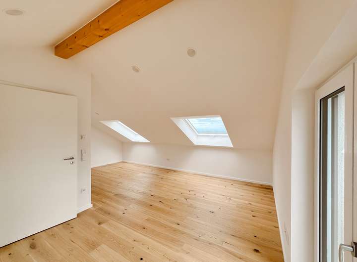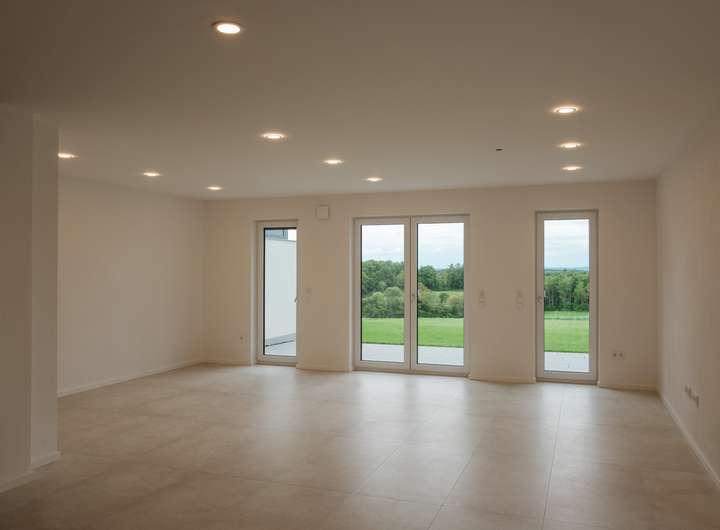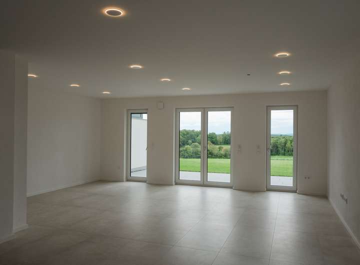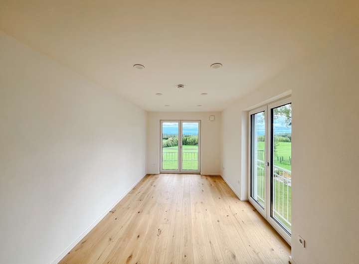 Im Erdgeschoss erwartet Sie ein großzügiger Wohn-, Ess- und Kochbereich mit direktem Zugang zur Terrasse und zum nach Südosten ausgerichteten Garten. Ein Eingangsbereich mit Garderobe sowie ein Gäste-WC vervollständigen diese Etage. Große Fensterfronten eröffnen einen herrlichen Blick auf Felder und Wälder.