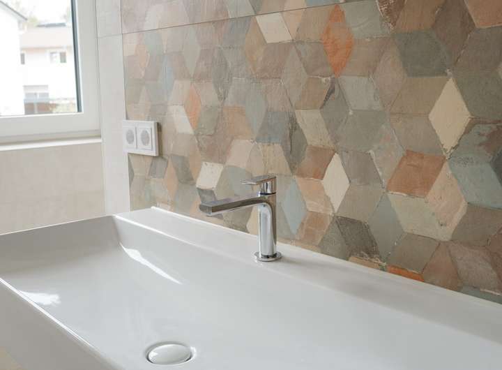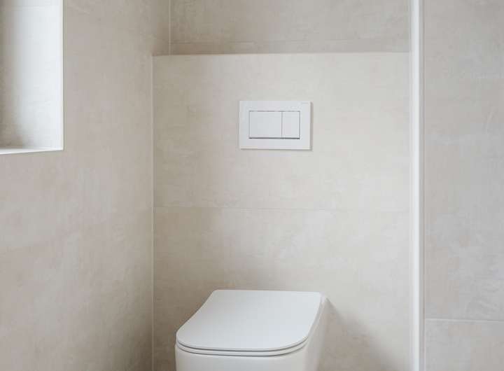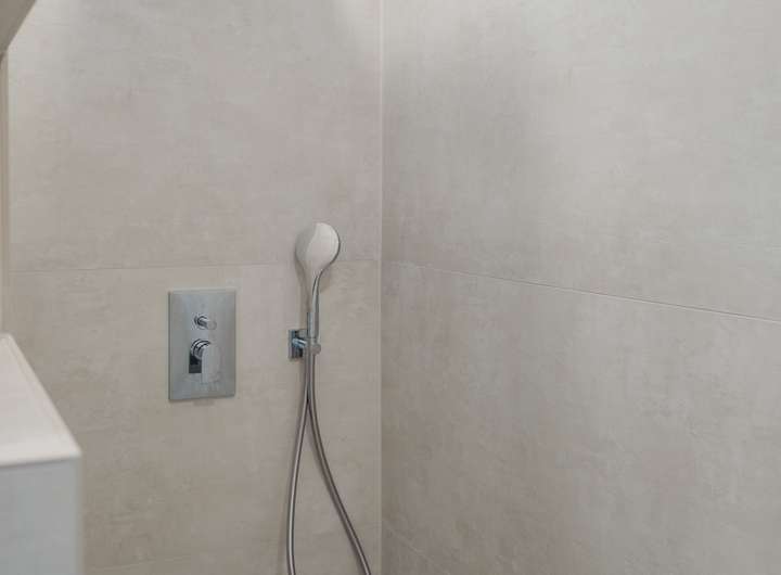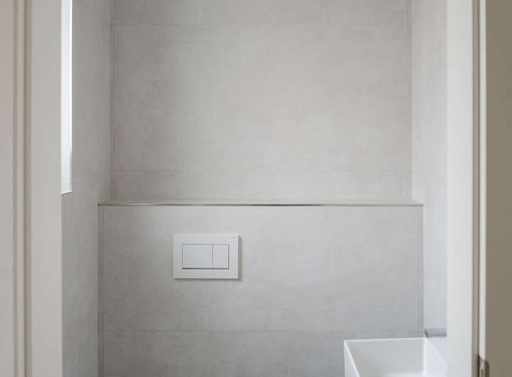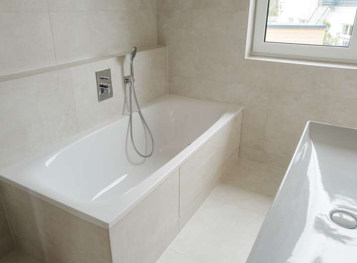 Das Obergeschoss umfasst drei Schlafzimmer und ein modernes Badezimmer mit Badewanne, ebenerdiger Dusche, WC und Doppelwaschbecken.