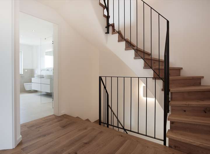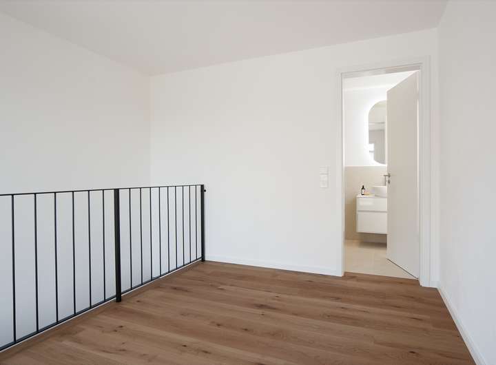 Über einen Windfang erreicht man zum einen den großzügig konzipierten Empfangsbereich des Hauses und zum anderen eine etwa 33 qm große Gästewohnung mit eigenem kleinem Duschbad. Die Gästewohnung ist hell und freundlich gestaltet und erstreckt sich über 2 Etagen, welche durch eine innenliegende Treppe verbunden sind. Der Empfangsbereich des Hauses bietet Platz für eine großzügige Garderobe und führt uns direkt in den lichtdurchfluteten Koch-, Ess- und Wohnbereich mit einer riesigen Hebe-Schiebe-Tür sowie zu einem separatem Gäste-WC und einem kleinen Abstellraum. Über die halb gewendelte Treppe mit Massivholzstufen aus gebürsteter Eiche und filigranem schwarzen Eisenstäben erreicht man das Obergeschoss, was sich in drei helle Räume, einem Badezimmer mit Fenster und einem Ankleidezimmer gliedert. Die Räume sind wahlweise als Schlaf- oder Kinderzimmer oder als Büro nutzbar. Das Badezimmer hat eine warme Atmosphäre und ist mit einer halb freistehenden Badewanne, einer großzügigen Echtglas-Dusche sowie zwei Waschtischen und einem WC ausgestattet. Ein absoluter Wohntraum ist das geräumige Studio im Dachgeschoss mit viel Tageslicht und einem Weitblick bis über die Felder der Umgebung. Aber auch im Untergeschoss hört der Luxus nicht auf. Neben dem Schlafbereich der Gästewohnung finden wir hier auch einen rund 23 qm großen Fitnessraum. Auch diese beiden Räume verfügen über viel Tageslicht, welches durch große Lichthöfe mit begehbaren Glasabdeckungen sichergestellt ist.