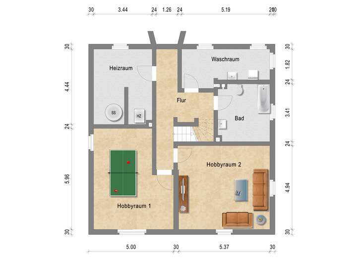 • Ausgebauter Keller mit Hobbyraum, Bad, Lagerraum und Büro-/Gästezimmeroption