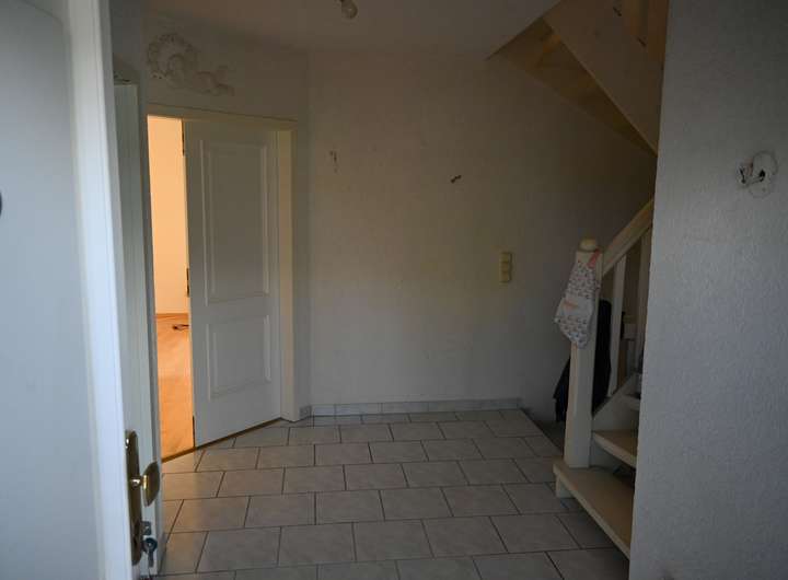 Im Erdgeschoß betritt man den Flur, von dem alle Räume im Erdgeschoß und über die Treppen in den Keller bzw. ins Dachgeschoß führen. Flur, Essbereich, Küche, Wohnen und WC sind mit Fliesen bzw. Parkettböden, Rauputz bzw. Raufasertapeten an den Wänden und Raufaser an den Decken.
