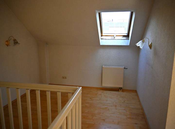 Die halbgewendelte Holztreppe mit Holzgeländer führt ins ausgebaute Dachgeschoß. Flur, Schlafen, Ankleide und Kinderzimmer sind mit Holzparkett ausgestattet und Wände und Decken wurden mit Raufasertapeten versehen.