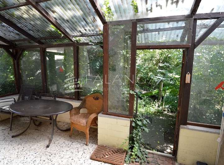 Das Anwesen verfügt im Erdgeschoss über einen Wohn-Essbereich, einer geräumigen Küche, einem Gäste Wc und ein weiteres Zimmer. Der verwilderte Wintergarten zum Eingang hin lässt den gemütlichen Charakter dieses Anwesen erahnen.