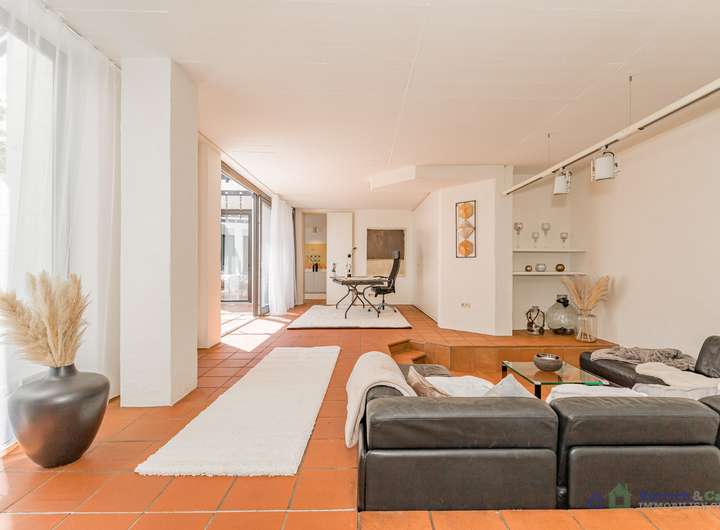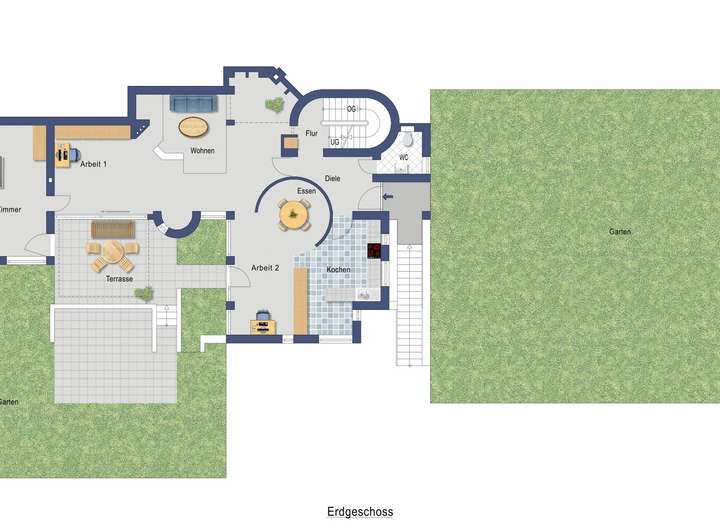 Beim Betreten des Hauses empfängt Sie ein großer Eingangsbereich mit einer massiven Treppe, die sowohl ins Untergeschoss als auch ins Obergeschoss führt. Rechtsseitig befindet sich ein Gäste-WC, während links die großzügige Küche zu finden ist. Geradeaus gelangen Sie in den großzügigen Wohn- und Essbereich, der mehrere besondere Merkmale aufweist. Rechts ist eine Öffnung nach oben hin, welche ein hohes Raumgefühl schafft. Direkt daneben gibt es eine Vertiefung im Boden für eine gemütliche Sitzgruppe. Eine großzügige Fläche, die zuletzt als Arbeitsplatz mit Blick auf den Terrassenbereich genutzt wurde, schließt sich an.