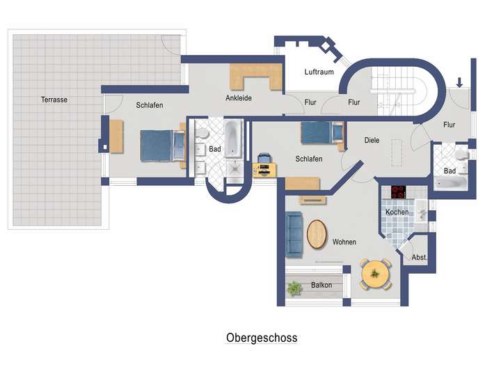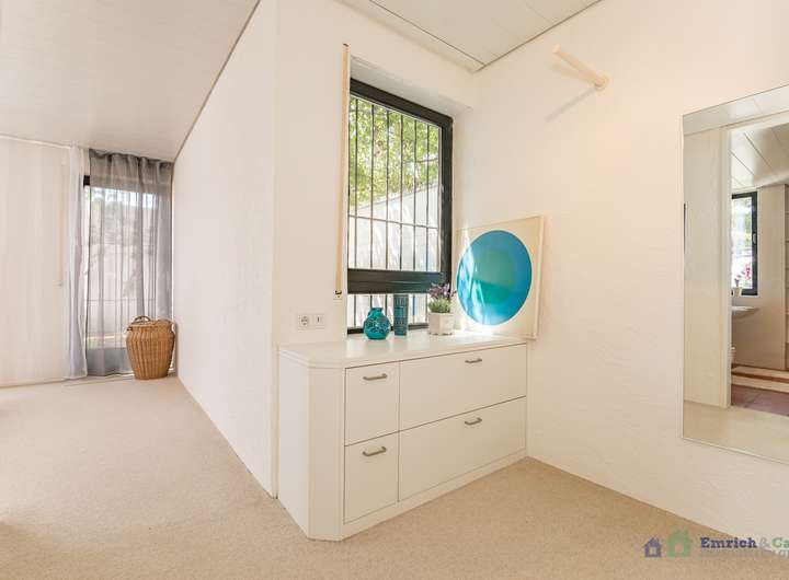 Über die Treppe im Eingangsbereich gelangen Sie ins Obergeschoss. Dort laufen Sie über eine Empore in den abgetrennten Schlafbereich mit kleiner Ankleide und voll ausgestattetem Tageslichtbadezimmer.