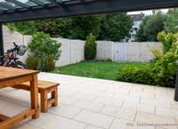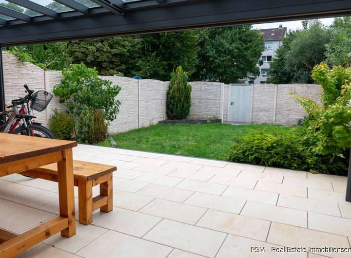 Ein weiteres Plus: Die große, überdachte Terrasse bietet Platz für gesellige Abende oder entspannte Stunden im Freien – mit direktem Zugang zum ca. 93 m² großen, grünen Garten, der dezent von den Nachbargrundstücken abgegrenzt ist und viel Privatsphäre bietet.
