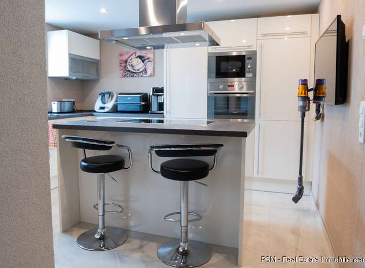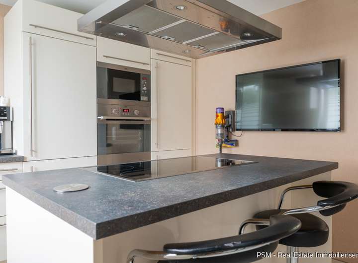 Die moderne Einbauküche mit zentraler Kochinsel ist das Herzstück des offenen Wohnbereichs. Sie lädt nicht nur zum Kochen ein, sondern wird zum Treffpunkt für Familie und Freunde.
