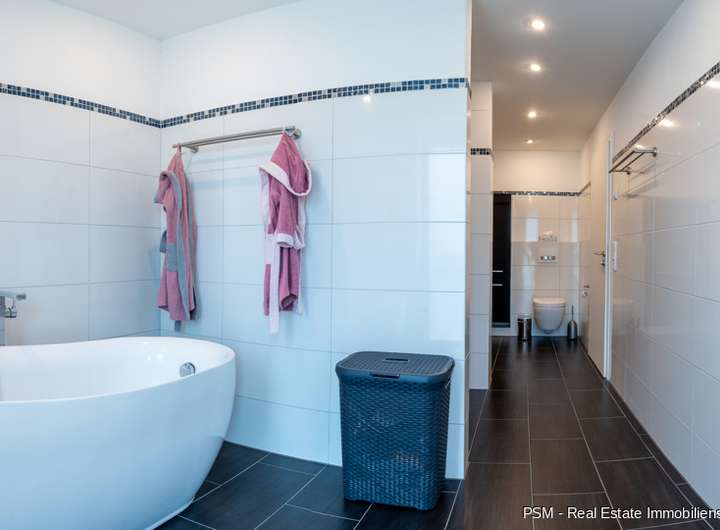 Das stilvoll ausgestattete Hauptbadezimmer mit freistehender Badewanne vermittelt Spa-Atmosphäre – ergänzt wird es durch ein weiteres Badezimmer sowie ein separates Gäste-WC.