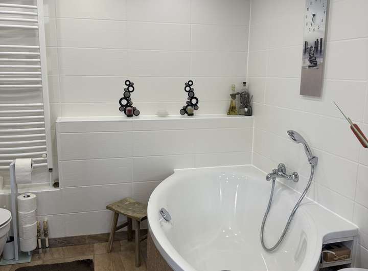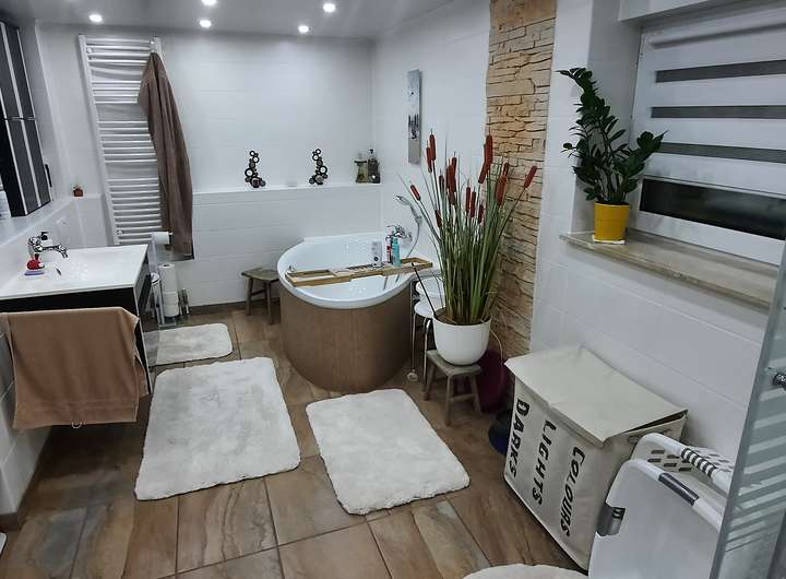 Fußbodenheizung im Bad, Bad mit Wanne und Dusche, mehrere Stellplätze am und vorm Haus, Gas-Zentralheizung (Niedertemperatur), unterirdische Regenwasser-Zisterne im Garten (5000 l) mit Einstiegsdom, Video-Überwachungsanlage mit Monitor, große Garage ca. 4 x 10 m mit elektrischem Rolltor,