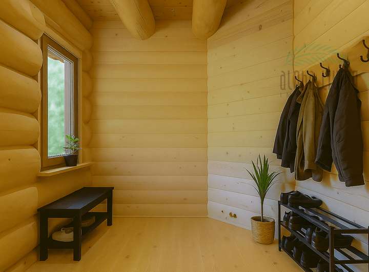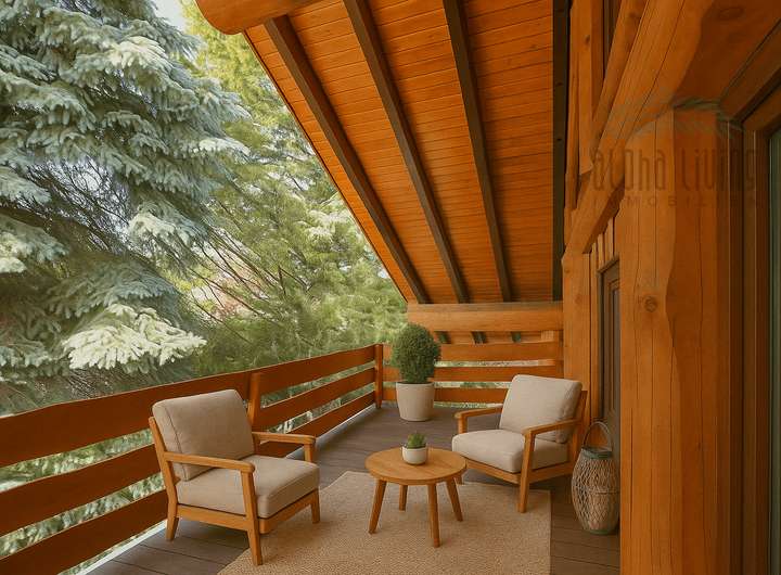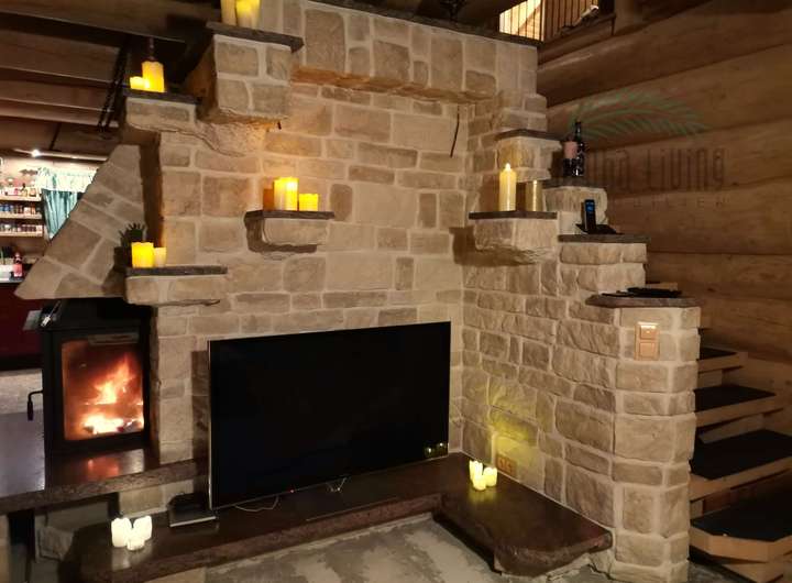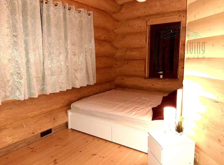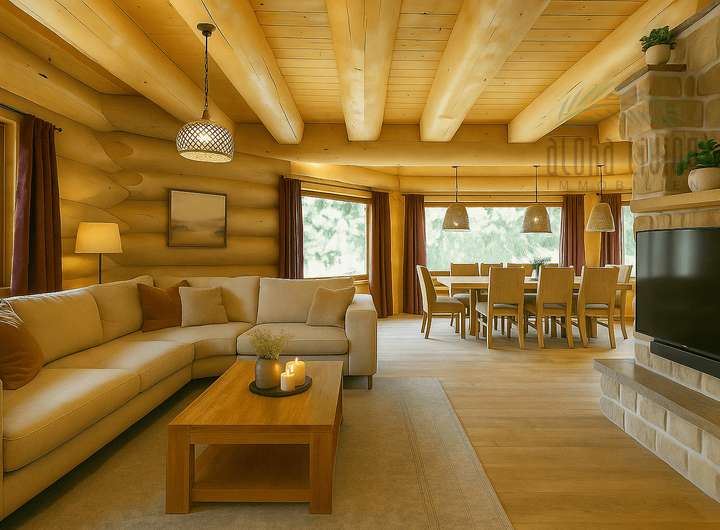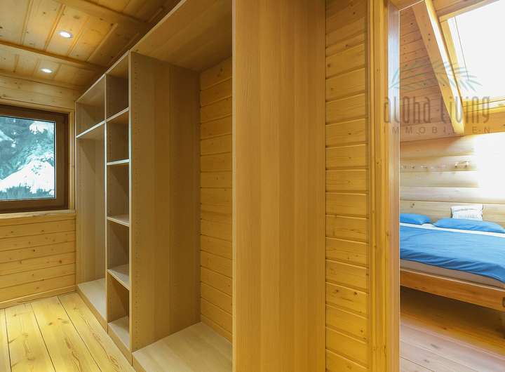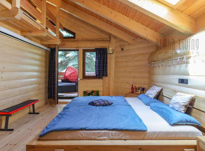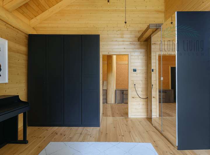 In diesem Naturstammhaus fühlst du dich nicht nur gut aufgehoben – du bist es. Die Wände atmen mit dir. Sie regulieren das Raumklima, schenken dir frische Luft, natürliche Wärme, Ruhe. Kein Beton. Kein Putz. Kein Lärm. Stattdessen: ein offenes Wohnzimmer, das sich um einen mächtigen Kamin schmiegt. Das Knistern des Feuers, das goldene Licht, das durch die Panoramafenster fällt – und mitten darin: du.