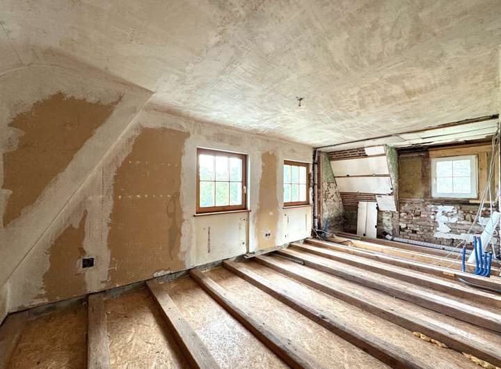 Im Obergeschoss wurde in den letzten Jahren bereits mit Sanierungsarbeiten begonnen. Installationen für ein modernes Duschbad, Wasserleitungen sowie Heizungsrohre für eine Fußbodenheizung sind bereits vorbereitet. Damit eröffnet sich Ihnen die Möglichkeit, den weiteren Ausbau nach eigenen Vorstellungen zu gestalten. Auch der Dachstuhl kann bei Bedarf ausgebaut werden und bietet Potenzial zur Wohnraumerweiterung.