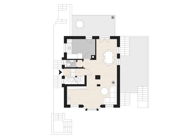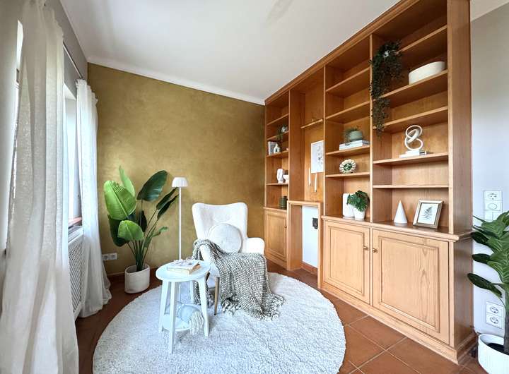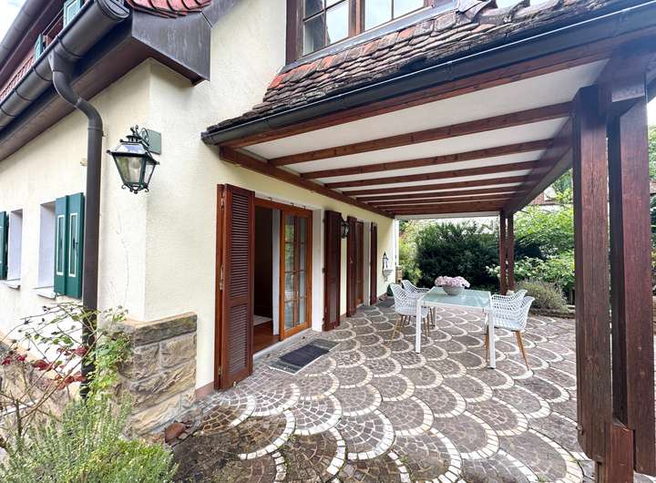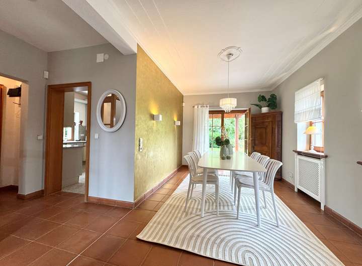 Bereits beim Betreten fällt die besondere Atmosphäre auf, die durch eine durchdachte Raumaufteilung und lichtdurchflutete Zimmer geschaffen wird. Im Erdgeschoss bildet der Wohnbereich den zentralen Mittelpunkt des Hauses. Von hier aus gelangen Sie über den Essbereich und die Küche direkt auf die überdachte Terrasse mit Blick in den liebevoll angelegten Garten. Dieser lädt nicht nur zum Entspannen, sondern auch zu geselligen Stunden mit Familie und Freunden ein. Ein stilvolles Gäste-WC ergänzt die Etage.