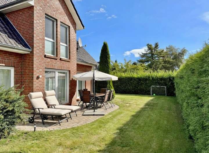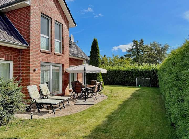 Draußen stehen Ihnen zwei Terrassenbereich zur Verfügung. Von morgens bis abends können Sie hier entspannte Stunden genießen. Der Garten ist so gestaltet, dass er einfach zu pflegen ist. Ideal für eine Familie mit Kindern.