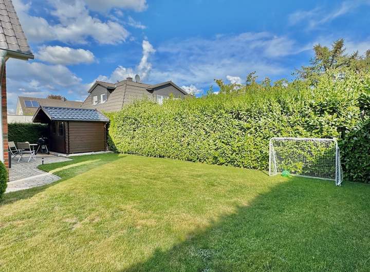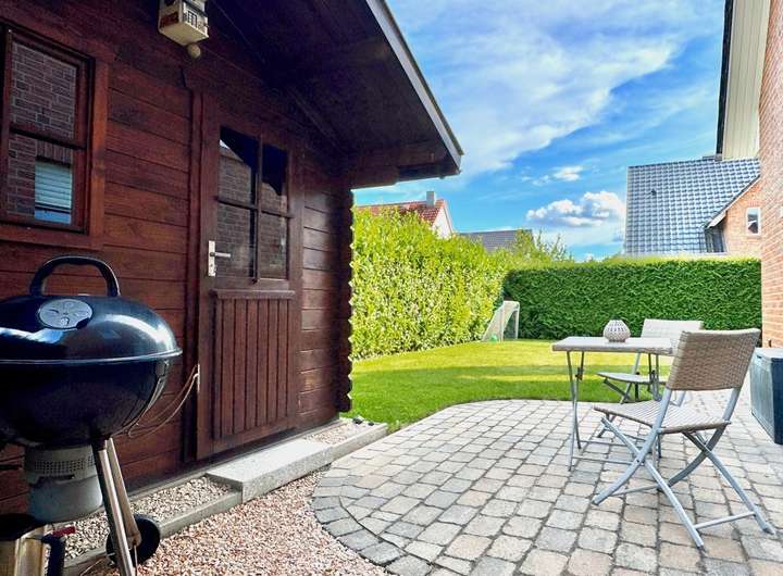 Der Garten verfügt zudem über ein Gartenhaus. Für zusätzlichen Platz sorgt die geräumige Garage mit angeschlossenem Abstellraum.