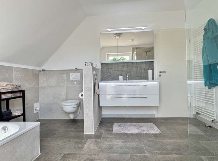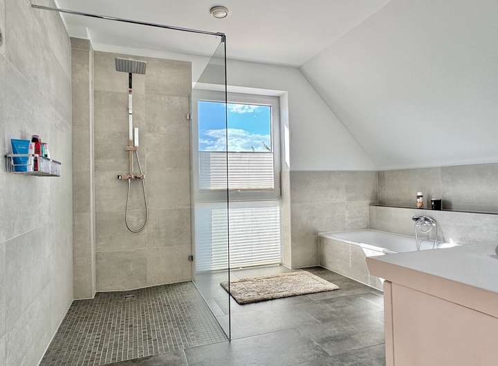 m Obergeschoss erreichen Sie über den Galerieflur drei Schlafzimmer sowie ein großzügiges Badezimmer mit Badewanne und Regenwasserdusche.