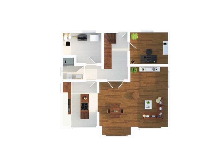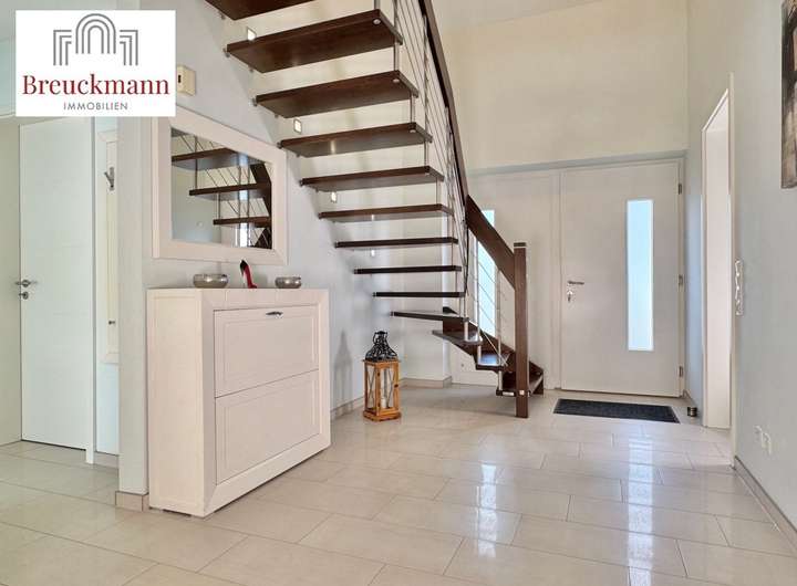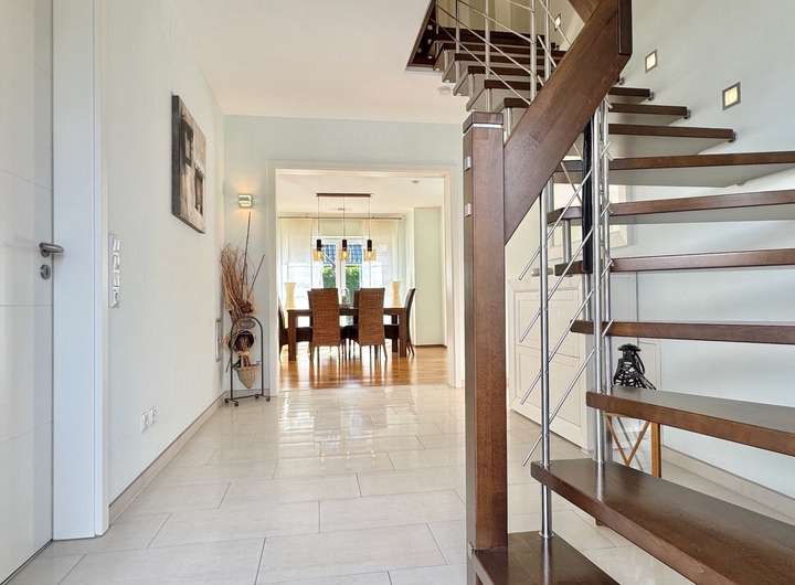 Empfangen werden Sie im einladenden Flur. Von hier gelangen Sie in den großzügigen, offenen Wohn- und Essbereich mit ebenfalls offenem Zugang zur Küche sowie zu den zwei Terrassenbereichen. Im Erdgeschoss finden Sie außerdem ein Gäste-Duschbad, ein Büro sowie den Hauswirtschaftsraum.