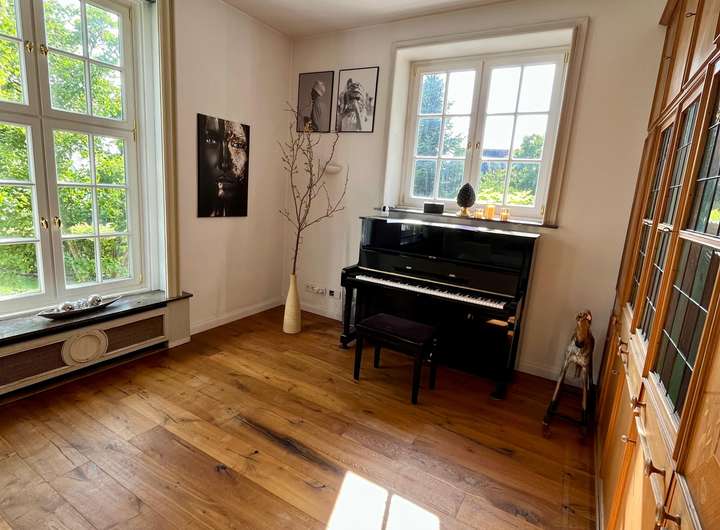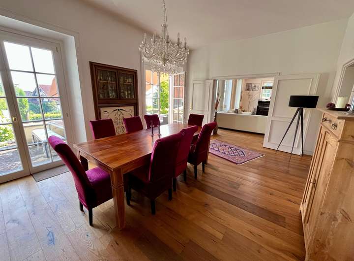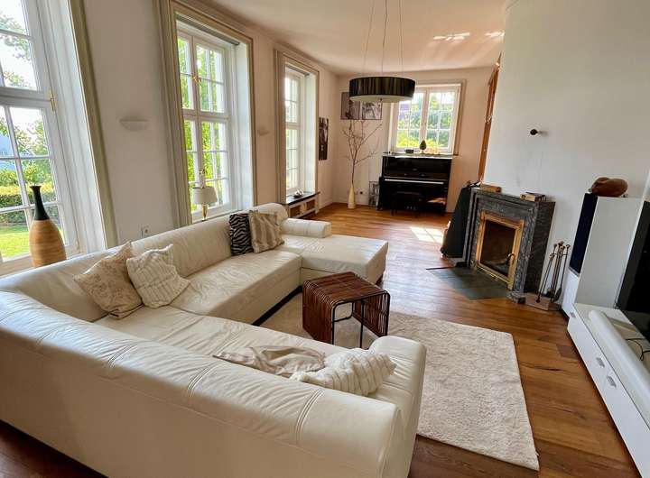 Mit rund 290 m² Wohnfläche, verteilt auf zwei Etagen und umgeben von einem parkähnlichen Garten, bietet das Anwesen vielseitige Nutzungsmöglichkeiten als Mehrgenerationenhaus oder Familiendomizil. Hohe Decken, originale Solnhoferplatten und edle Parkettböden verleihen den Räumen eine elegante Atmosphäre.